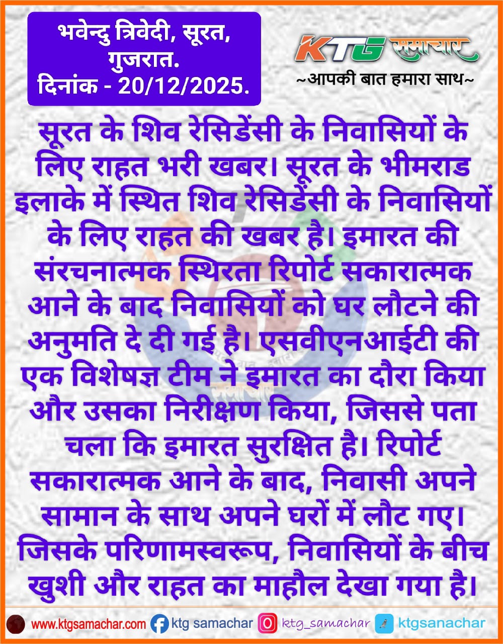 सूरत के शिव रेसिडेंसी के निवासियों के लिए राहत भरी खबर।
