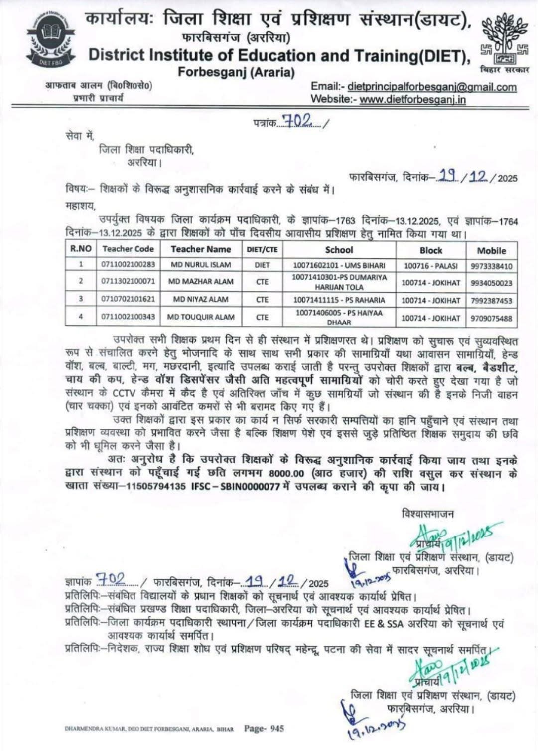 प्राचार्य, DIET फारबिसगंज द्वारा जिला शिक्षा पदाधिकारी, अररिया को भेजे गए पत्र (पत्रांक 702, दिनांक 19/12/2025) के अनुसार, संबंधित शिक्षक पाँच दिवसीय आवासीय प्रशिक्षण के लिए संस्थान में ठहरे हुए थे। प्रशिक्षण के दौरान संस्थान की सरकारी संपत्ति के दुरुपयोग एवं चोरी की घटनाएँ सामने आईं।