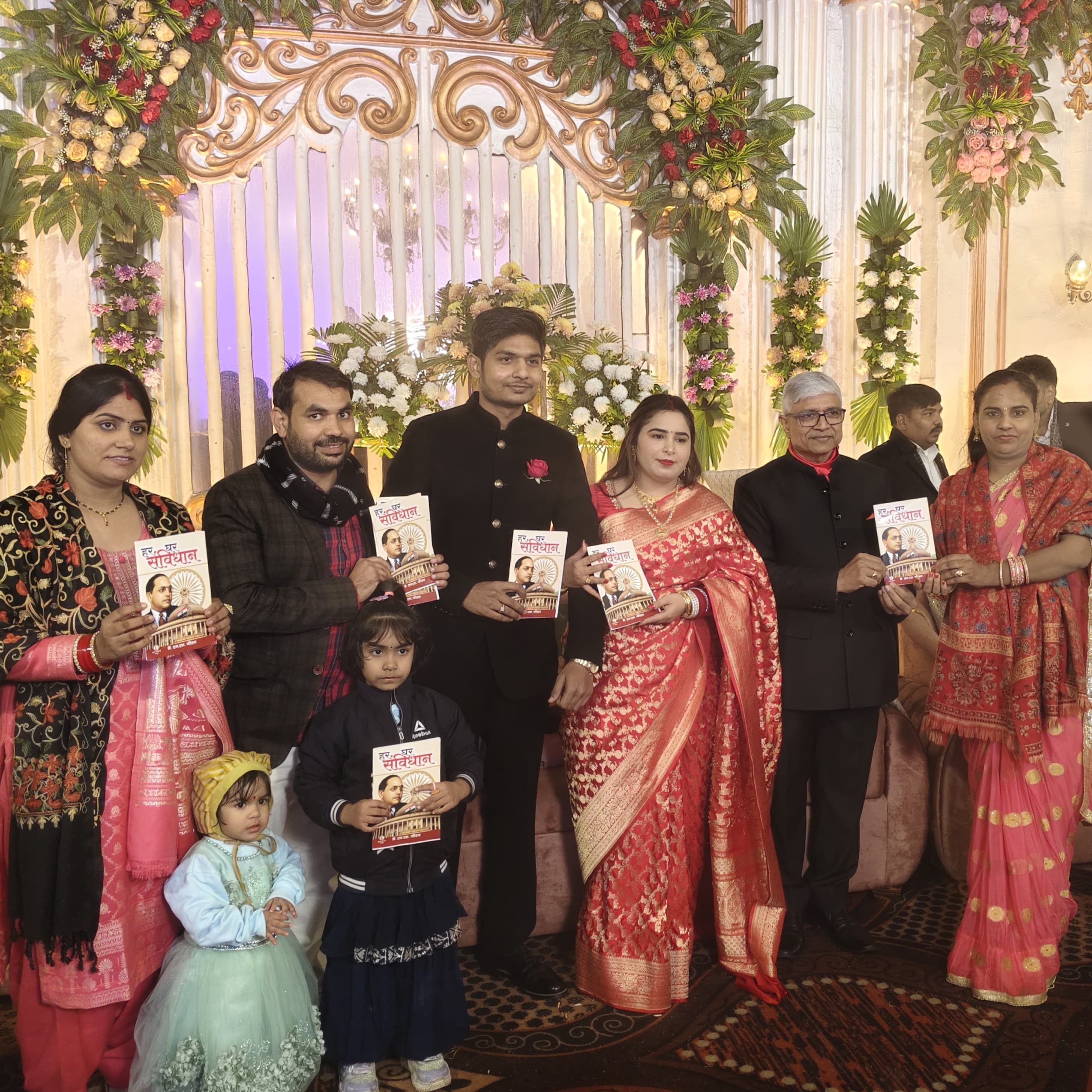 नई दिल्ली / सुमित कुमार बैरवा ।। मिशन हर घर संविधान अभियान के अंतर्गत एक प्रेरणादायी पहल देखने को मिली, जब पूर्व मंत्री एवं सामाजिक न्याय के प्रखर समर्थक राजेंद्र पाल गौतम के बेटे के शादी के आशीर्वाद समारोह में दूल्हा-दुल्हन सहित परिवार के सभी सदस्यों को संविधान जागृति मंच के सदस्य मनीषा बलराम मीणा सुमन सुरेश मीणा के द्वारा भारतीय संविधान की प्रतियां भेंट की गईं।इस अवसर पर यह संदेश दिया गया कि विवाह और पारिवारिक संस्कार केवल सामाजिक परंपराओं तक सीमित नहीं हैं, बल्कि वे संवैधानिक मूल्यों—समानता, स्वतंत्रता, न्याय और बंधुत्व—को अपनाने और आगे बढ़ाने का भी माध्यम बन सकते हैं। दूल्हा-दुल्हन को संविधान भेंट कर उनके वैवाहिक जीवन की शुरुआत संविधान के आदर्शों के साथ करने की प्रेरणा दी गई।