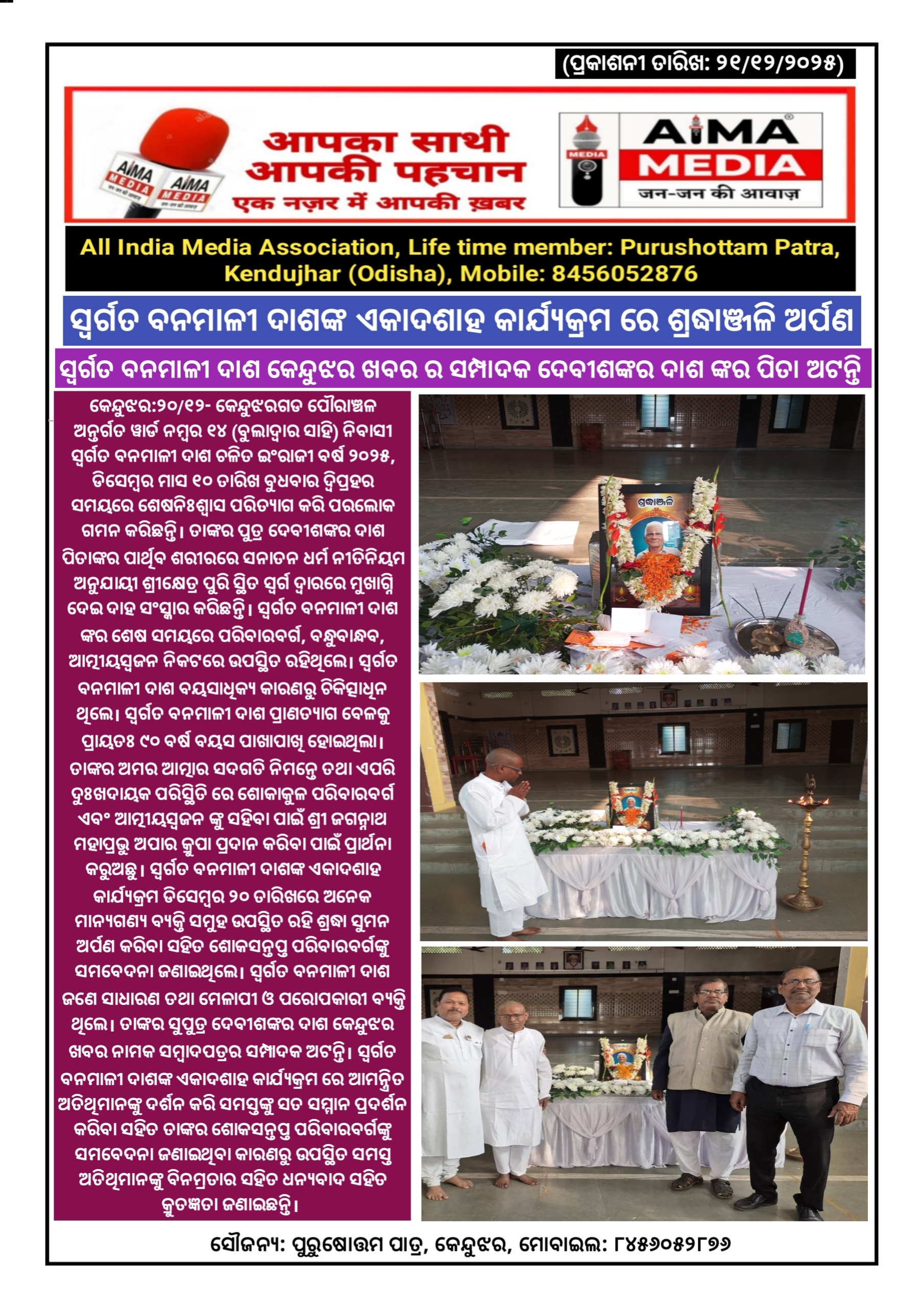 କେନ୍ଦୁଝର:୨୦/୧୨- କେନ୍ଦୁଝରଗଡ ପୌରାଞ୍ଚଳ ଅନ୍ତର୍ଗତ ୱାର୍ଡ ନମ୍ବର ୧୪ (ବୁଲାଦ୍ବାର ସାହି) ନିବାସୀ ସ୍ବର୍ଗତ ବନମାଳୀ ଦାଶ ଚଳିତ ଇଂରାଜୀ ବର୍ଷ ୨୦୨୫, ଡିସେମ୍ବର ମାସ ୧୦ ତାରିଖ ବୁଧବାର ଦ୍ବିପ୍ରହର ସମୟରେ ଶେଷନିଃଶ୍ଵାସ ପରିତ୍ଯାଗ କରି ପରଲୋକ ଗମନ କରିଛନ୍ତି। ତାଙ୍କର ପୁତ୍ର ଦେବୀଶଙ୍କର ଦାଶ ପିତାଙ୍କର ପାର୍ଥିବ ଶରୀରରେ ସନାତନ ଧର୍ମ ନୀତିନିୟମ ଅନୁଯାୟୀ ଶ୍ରୀକ୍ଷେତ୍ର ପୁରି ସ୍ଥିତ ସ୍ବର୍ଗ ଦ୍ବାରରେ ମୁଖାଗ୍ନି ଦେଇ ଦାହ ସଂସ୍କାର କରିଛନ୍ତି। ସ୍ବର୍ଗତ ବନମାଳୀ ଦାଶ ଙ୍କର ଶେଷ ସମୟରେ ପରିବାରବର୍ଗ, ବନ୍ଧୁବାନ୍ଧବ, ଆତ୍ମୀୟସ୍ବଜନ ନିକଟରେ ଉପସ୍ଥିତ ରହିଥିଲେ। ସ୍ବର୍ଗତ ବନମାଳୀ ଦାଶ ବୟସାଧିକ୍ୟ କାରଣରୁ ଚିକିତ୍ସାଧିନ ଥିଲେ। ସ୍ବର୍ଗତ ବନମାଳୀ ଦାଶ ପ୍ରାଣତ୍ଯାଗ ବେଳକୁ ପ୍ରାୟତଃ ୯୦ ବର୍ଷ ବୟସ ପାଖାପାଖି ହୋଇଥିଲା। ତାଙ୍କର ଅମର ଆତ୍ମାର ସଦଗତି ନିମନ୍ତେ ତଥା ଏପରି ଦୁଃଖଦାୟକ ପରିସ୍ଥିତି ରେ ଶୋକାକୁଳ ପରିବାରବର୍ଗ ଏବଂ ଆତ୍ମୀୟସ୍ବଜନ ଙ୍କୁ ସହିବା ପାଇଁ ଶ୍ରୀ ଜଗନ୍ନାଥ ମହାପ୍ରଭୁ ଅପାର କ୍ରୁପା ପ୍ରଦାନ କରିବା ପାଇଁ ପ୍ରାର୍ଥନା କରୁଅଛୁ। ସ୍ବର୍ଗତ ବନମାଳୀ ଦାଶଙ୍କ ଏକାଦଶାହ କାର୍ଯ୍ୟକ୍ରମ ଡିସେମ୍ବର ୨୦ ତାରିଖରେ ଅନେକ ମାନ୍ୟଗଣ୍ୟ ବ୍ଯକ୍ତି ସମୁହ ଉପସ୍ଥିତ ରହି ଶ୍ରଦ୍ଧା ସୁମନ ଅର୍ପଣ କରିବା ସହିତ ଶୋକସନ୍ତପ୍ତ ପରିବାରବର୍ଗଙ୍କୁ ସମବେଦନା ଜଣାଇଥିଲେ। ସ୍ବର୍ଗତ ବନମାଳୀ ଦାଶ ଜଣେ ସାଧାରଣ ତଥା ମେଳାପୀ ଓ ପରୋପକାରୀ ବ୍ଯକ୍ତି ଥିଲେ। ତାଙ୍କର ସୁପୁତ୍ର ଦେବୀଶଙ୍କର ଦାଶ କେନ୍ଦୁଝର ଖବର ନାମକ ସମ୍ବାଦପତ୍ରର ସମ୍ପାଦକ ଅଟନ୍ତି। ସ୍ବର୍ଗତ ବନମାଳୀ ଦାଶଙ୍କ ଏକାଦଶାହ କାର୍ଯ୍ୟକ୍ରମ ରେ ଆମନ୍ତ୍ରିତ ଅତିଥିମାନଙ୍କୁ ଦର୍ଶନ କରି ସମସ୍ତଙ୍କୁ ସତ ସମ୍ମାନ ପ୍ରଦର୍ଶନ କରିବା ସହିତ ତାଙ୍କର ଶୋକସନ୍ତପ୍ତ ପରିବାରବର୍ଗଙ୍କୁ ସମବେଦନା ଜଣାଇଥିବା କାରଣରୁ ଉପସ୍ଥିତ ସମସ୍ତ ଅତିଥିମାନଙ୍କୁ ବିନମ୍ରତାର ସହିତ ଧନ୍ଯବାଦ ସହିତ କ୍ରୁତଜ୍ଞତା ଜଣାଇଛନ୍ତି।