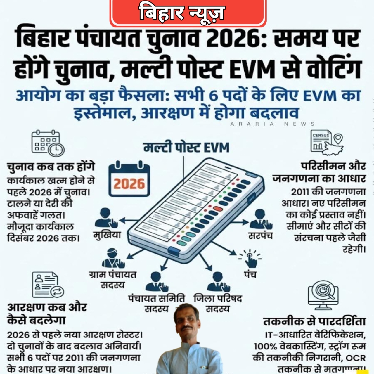 बिहार में पंचायत आम निर्वाचन 2026 को लेकर तस्वीर साफ हो गई है। चुनाव समय पर होंगे और वोटिंग इस बार पूरी तरह मल्टी पोस्ट EVM से कराई जाएगी।