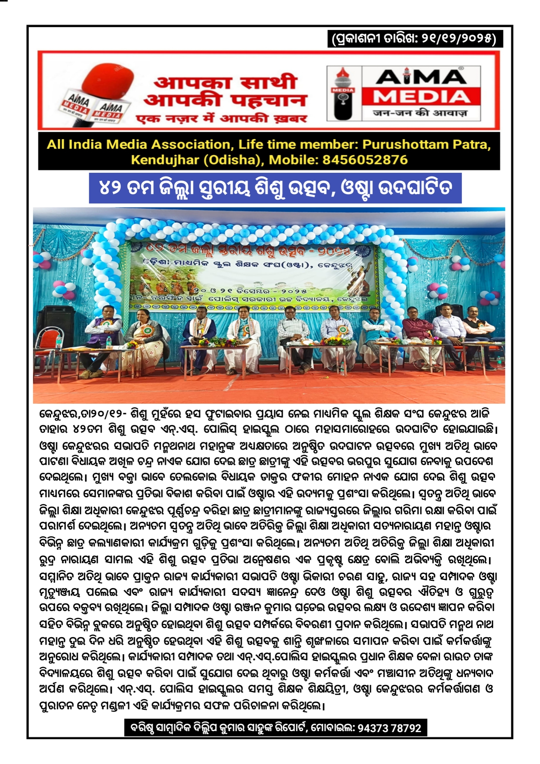 କେନ୍ଦୁଝର,ତା୨୦/୧୨- ଶିଶୁ ମୁହଁରେ ହସ ଫୁଟାଇବାର ପ୍ରୟାସ ନେଇ ମାଧ୍ୟମିକ ସ୍କୁଲ ଶିକ୍ଷକ ସଂଘ କେନ୍ଦୁଝର ଆଜି ତାହାର ୪୨ତମ ଶିଶୁ ଉତ୍ସବ ଏନ୍.ଏସ୍. ପୋଲିସ୍ ହାଇସ୍କୁଲ ଠାରେ ମହାସମାରୋହରେ ଉଦଘାଟିତ ହୋଇଯାଇଛି। ଓଷ୍ଟା କେନ୍ଦୁଝରର ସଭାପତି ମନ୍ମଥନାଥ ମହାନ୍ତଙ୍କ ଅଧ୍ୟକ୍ଷତାରେ ଅନୁଷ୍ଠିତ ଉଦଘାଟନ ଉତ୍ସବରେ ମୁଖ୍ୟ ଅତିଥି ଭାବେ ପାଟଣା ବିଧାୟକ ଅଖିଳ ଚନ୍ଦ୍ର ନାଏକ ଯୋଗ ଦେଇ ଛାତ୍ର ଛାତ୍ରୀଙ୍କୁ ଏହି ଉତ୍ସବର ଭରପୁର ସୁଯୋଗ ନେବାକୁ ଉପଦେଶ ଦେଇଥିଲେ। ମୁଖ୍ୟ ବକ୍ତା ଭାବେ ତେଲକୋଇ ବିଧାୟକ ଡାକ୍ତର ଫକୀର ମୋହନ ନାଏକ ଯୋଗ ଦେଇ ଶିଶୁ ଉତ୍ସବ ମାଧ୍ୟମରେ ସେମାନଙ୍କର ପ୍ରତିଭା ବିକାଶ କରିବା ପାଇଁ ଓଷ୍ଟାର ଏହି ଉଦ୍ୟମକୁ ପ୍ରଶଂସା କରିଥିଲେ।ସ୍ଵତନ୍ତ୍ର ଅତିଥି ଭାବେ ଜିଲ୍ଲା ଶିକ୍ଷା ଅଧିକାରୀ କେନ୍ଦୁଝର ପୂର୍ଣ୍ଣଚନ୍ଦ୍ର ବରିହା ଛାତ୍ର ଛାତ୍ରୀମାନଙ୍କୁ ରାଜ୍ୟସ୍ତରରେ ଜିଲ୍ଲାର ଗରିମା ରକ୍ଷା କରିବା ପାଇଁ ପରାମର୍ଶ ଦେଇଥିଲେ। ଅନ୍ୟତମ ସ୍ଵତନ୍ତ୍ର ଅତିଥି ଭାବେ ଅତିରିକ୍ତ ଜିଲ୍ଲା ଶିକ୍ଷା ଅଧିକାରୀ ସତ୍ୟନାରାୟଣ ମହାନ୍ତ ଓଷ୍ଟାର ବିଭିନ୍ନ ଛାତ୍ର କଲ୍ୟାଣକାରୀ କାର୍ଯ୍ୟକ୍ରମ ଗୁଡ଼ିକୁ ପ୍ରଶଂସା କରିଥିଲେ। ଅନ୍ୟତମ ଅତିଥି ଅତିରିକ୍ତ ଜିଲ୍ଲା ଶିକ୍ଷା ଅଧିକାରୀ ରୁଦ୍ର ନାରାୟଣ ସାମଲ ଏହି ଶିଶୁ ଉତ୍ସବ ପ୍ରତିଭା ଅନ୍ୱେଷଣର ଏକ ପ୍ରକୃଷ୍ଟ କ୍ଷେତ୍ର ବୋଲି ଅଭିବ୍ୟକ୍ତି ରଖିଥିଲେ। ସମ୍ମାନିତ ଅତିଥି ଭାବେ ପ୍ରାକ୍ତନ ରାଜ୍ୟ କାର୍ଯ୍ୟକାରୀ ସଭାପତି ଓଷ୍ଟା ଭିକାରୀ ଚରଣ ସାହୁ, ରାଜ୍ୟ ସହ ସମ୍ପାଦକ ଓଷ୍ଟା ମୃତ୍ୟୁଞ୍ଜୟ ପଲେଇ ଏବଂ ରାଜ୍ୟ କାର୍ଯ୍ୟକାରୀ ସଦସ୍ୟ ଜ୍ଞାନେନ୍ଦ୍ର ଦେଓ ଓଷ୍ଟା ଶିଶୁ ଉତ୍ସବର ଐତିହ୍ୟ ଓ ଗୁରୁତ୍ଵ ଉପରେ ବକ୍ତବ୍ୟ ରଖିଥିଲେ। ଜିଲ୍ଲା ସମ୍ପାଦକ ଓଷ୍ଟା ରଞ୍ଜନ କୁମାର ଘଡେ଼ଇ ଉତ୍ସବର ଲକ୍ଷ୍ୟ ଓ ଉଦ୍ଦେଶ୍ୟ ଜ୍ଞାପନ କରିବା ସହିତ ବିଭିନ୍ନ ବ୍ଲକରେ ଅନୁଷ୍ଠିତ ହୋଇଥିବା ଶିଶୁ ଉତ୍ସବ ସମ୍ପର୍କରେ ବିବରଣୀ ପ୍ରଦାନ କରିଥିଲେ। ସଭାପତି ମନ୍ମଥ ନାଥ ମହାନ୍ତ ଦୁଇ ଦିନ ଧରି ଅନୁଷ୍ଠିତ ହେଉଥିବା ଏହି ଶିଶୁ ଉତ୍ସବକୁ ଶାନ୍ତି ଶୃଙ୍ଖଳାରେ ସମାପନ କରିବା ପାଇଁ କର୍ମକର୍ତ୍ତାଙ୍କୁ ଅନୁରୋଧ କରିଥିଲେ।କାର୍ଯ୍ୟକାରୀ ସମ୍ପାଦକ ତଥା ଏନ୍.ଏସ୍.ପୋଲିସ ହାଇସ୍କୁଲର ପ୍ରଧାନ ଶିକ୍ଷକ ବେଳା ରାଉତ ତାଙ୍କ ବିଦ୍ୟାଳୟରେ ଶିଶୁ ଉତ୍ସବ କରିବା ପାଇଁ ସୁଯୋଗ ଦେଇ ଥିବାରୁ ଓଷ୍ଟା କର୍ମକର୍ତ୍ତା ଏବଂ ମଞ୍ଚାସୀନ ଅତିଥିଙ୍କୁ ଧନ୍ୟବାଦ ଅର୍ପଣ କରିଥିଲେ। ଏନ୍.ଏସ୍. ପୋଲିସ ହାଇସ୍କୁଲର ସମସ୍ତ ଶିକ୍ଷକ ଶିକ୍ଷୟିତ୍ରୀ,ଓଷ୍ଟା କେନ୍ଦୁଝରର କର୍ମକର୍ତ୍ତାଗଣ ଓ ପୁରାତନ ନେତୃ ମଣ୍ଡଳୀ ଏହି କାର୍ଯ୍ୟକ୍ରମର ସଫଳ ପରିଚାଳନା କରିଥିଲେ।
