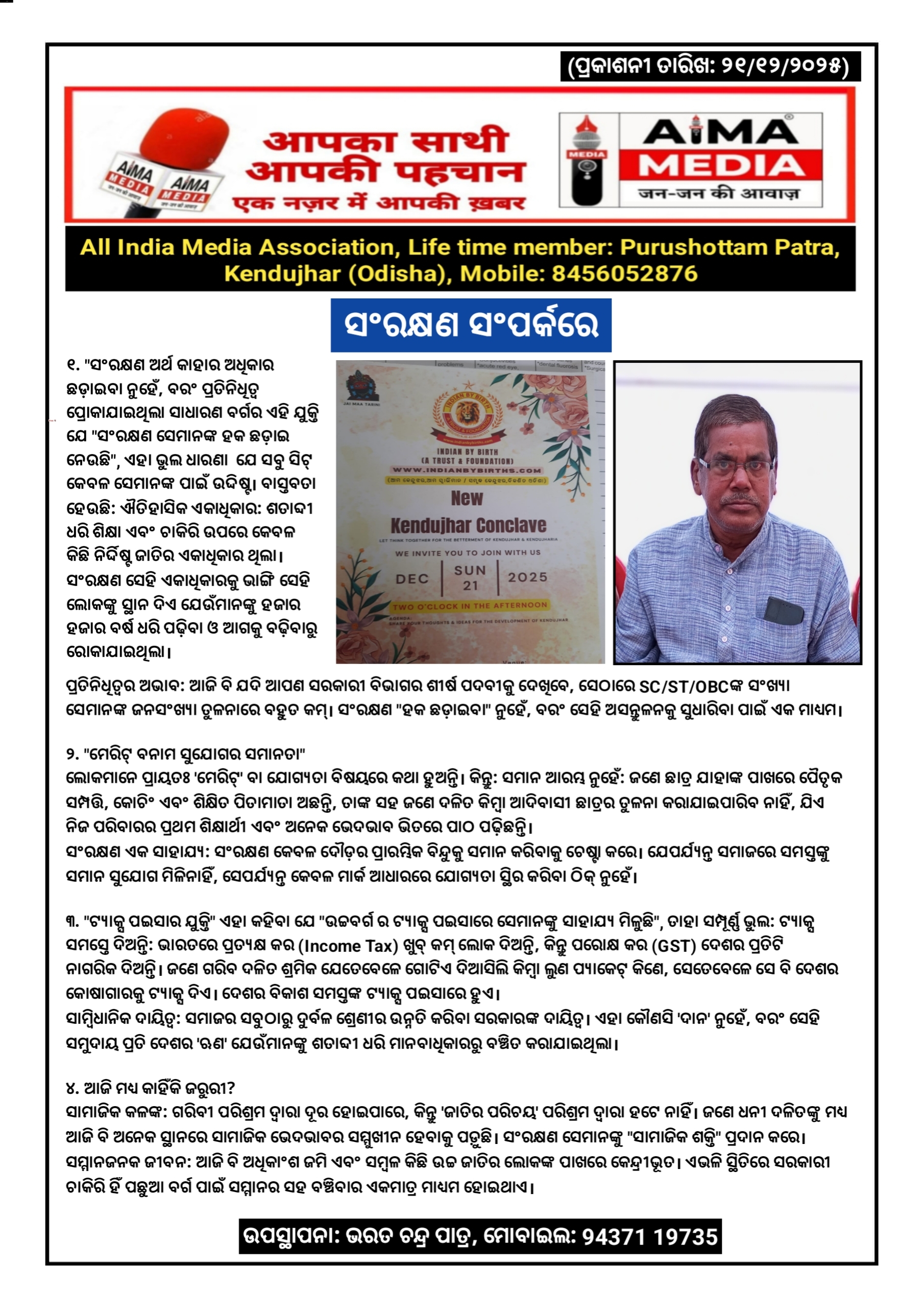 ସଂରକ୍ଷଣ ସଂପର୍କରେ - ଭରତ ଚନ୍ଦ୍ର ପାତ୍ର ଙ୍କ ଦ୍ଵାରା ବିଶେଷ ଉପସ୍ଥାପନା।