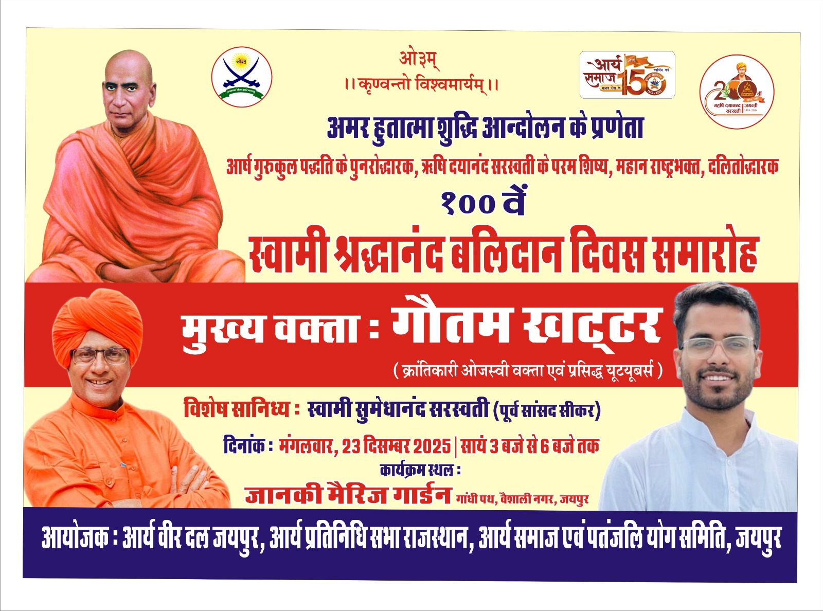 अमर हुतात्मा, शुद्धि आन्दोलन के प्रणेता तथा पुनरोद्धारक, ऋषि दयानंद जी महाराज के परम शिष्य, महान राष्ट्रभक्त, दलितों के उद्धारक, गुरूकुल शिक्षा पद्धति के जनक, स्वामी श्रद्धानंद जी महाराज के 100 वे बलिदान दिवस का कार्यक्रम मंगलवार, 23 दिसम्बर 2025 सायं 3 बजे से 6 बजे तक जानकी मैरिज गार्डन गांधी पथ, वैशाली नगर, जयपुर में मनाया जा रहा है।