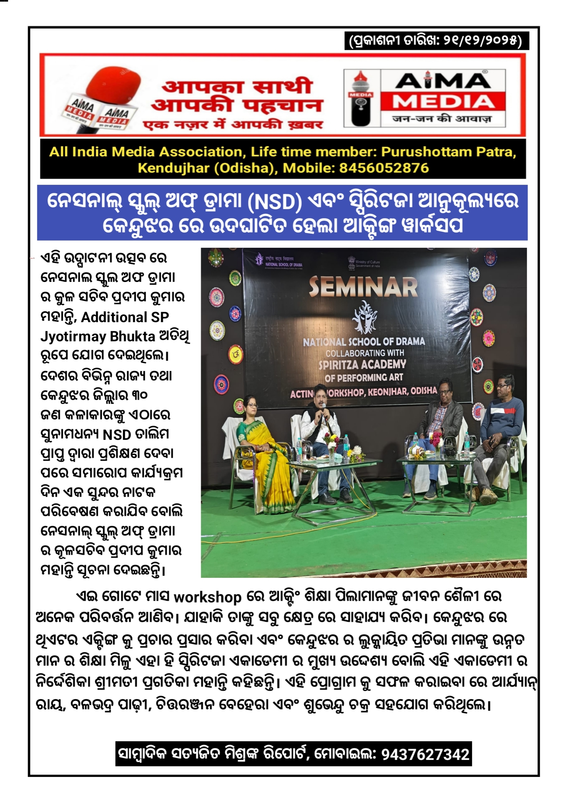 ନେସନାଲ୍ ସ୍କୁଲ୍ ଅଫ୍ ଡ୍ରାମା (NSD)ଏବଂ ସ୍ପିରିଟଜା ଆନୁକୂଲ୍ୟରେ କେନ୍ଦୁଝର ରେ ଉଦଘାଟିତ ହେଲା ଆକ୍ଟିଙ୍ଗ ୱାର୍କଶୋପ୍।