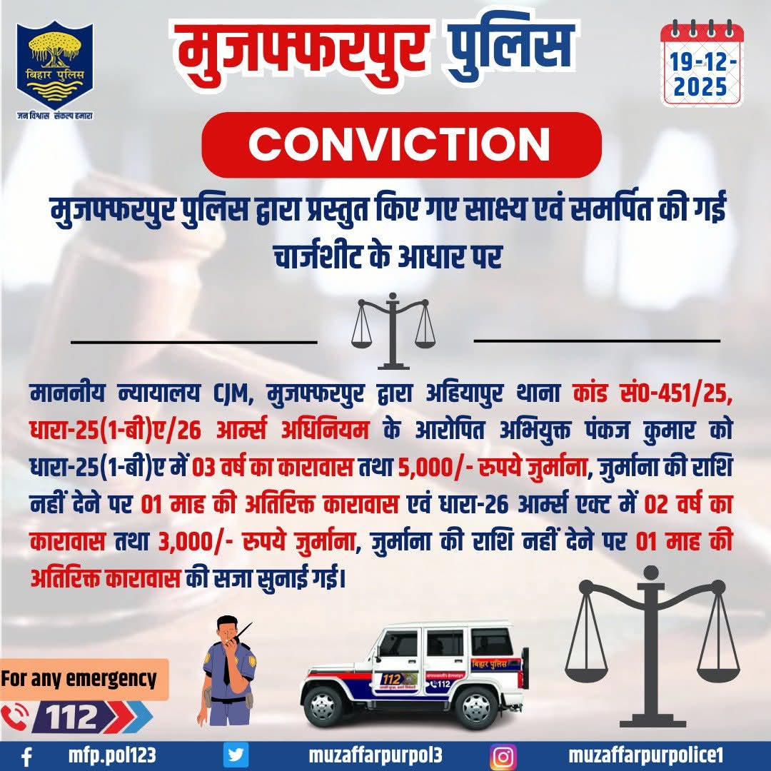 माननीय न्यायालय CJM, मुजफ्फरपुर द्वारा अहियापुर थाना कांड सं०-451/25, धारा-25(1-बी)ए/26 आर्म्स अधिनियम के आरोपित अभियुक्त पंकज कुमार को धारा-25(1-बी)ए में 03 वर्ष का कारावास तथा 5,000/- रुपये जुर्माना, जुर्माना की राशि नहीं देने पर 01 माह की अतिरिक्त कारावास एवं धारा-26 आर्म्स एक्ट में 02 वर्ष का कारावास तथा 3,000/- रुपये जुर्माना, जुर्माना की राशि नहीं देने पर 01 माह की अतिरिक्त कारावास की सजा सुनाई गई।