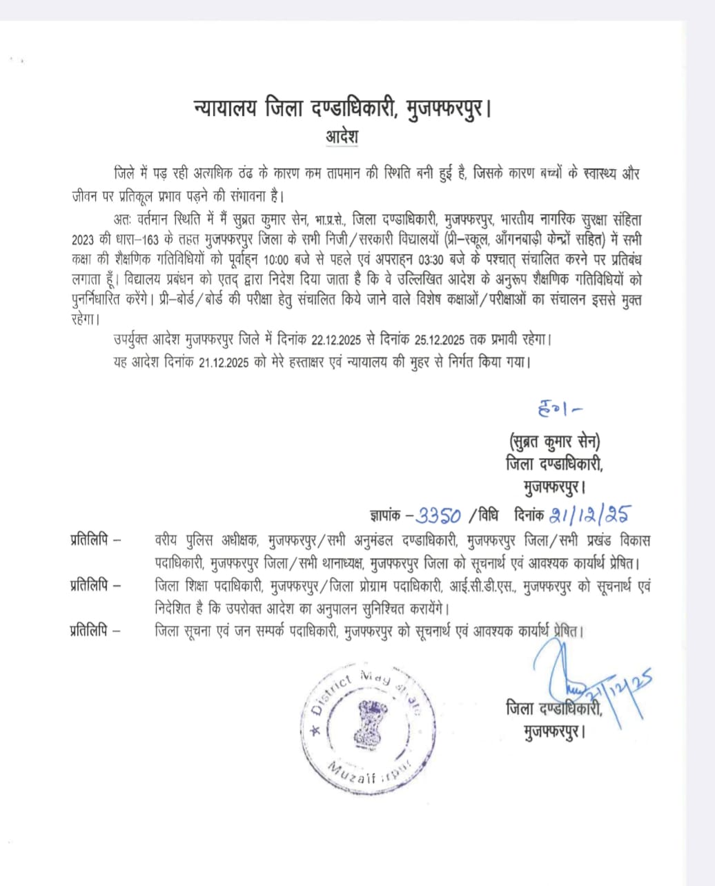#मुजफ्फरपुर : जिले में लगातार पड़ रही अत्यधिक ठंड एवं न्यूनतम तापमान में गिरावट के कारण बच्चों के स्वास्थ्य एवं जीवन पर प्रतिकूल प्रभाव पड़ने की आशंका को देखते हुए जिलाधिकारी ने एहतियातन महत्वपूर्ण निर्णय लिया है। जिलाधिकारी सुब्रत कुमार सेन द्वारा भारतीय नागरिक सुरक्षा संहिता, 2023 की धारा 163 के अंतर्गत मुजफ्फरपुर जिले के सभी सरकारी एवं निजी विद्यालयों (प्री-स्कूल एवं आंगनबाड़ी केंद्रों सहित) के संचालन समय में अस्थायी परिवर्तन का आदेश निर्गत किया गया है।