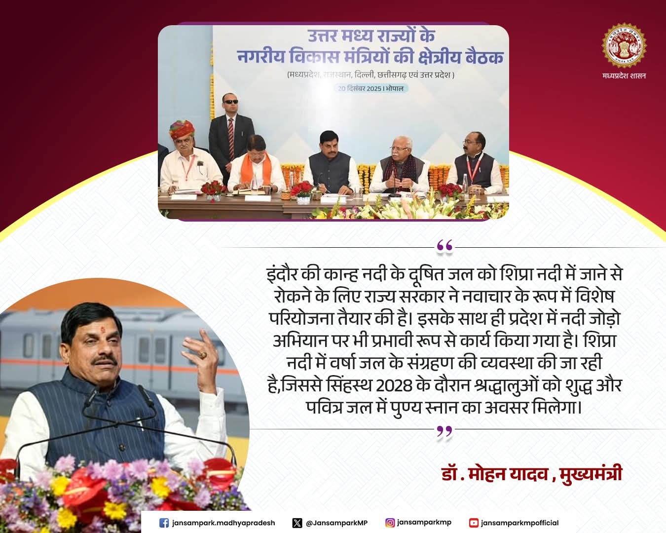 इंदौर की कान्ह नदी के दूषित जल को शिप्रा नदी में जाने से रोकने के लिए राज्य सरकार ने नवाचार के रूप में विशेष परियोजना तैयार की है। इसके साथ ही प्रदेश में नदी जोड़ो अभियान पर भी प्रभावी रूप से कार्य किया गया है। शिप्रा नदी में वर्षा जल के संग्रहण की व्यवस्था की जा रही है,जिससे सिंहस्थ 2028 के दौरान श्रद्धालुओं को शुद्ध और पवित्र जल में पुण्य स्नान का अवसर मिलेगा।