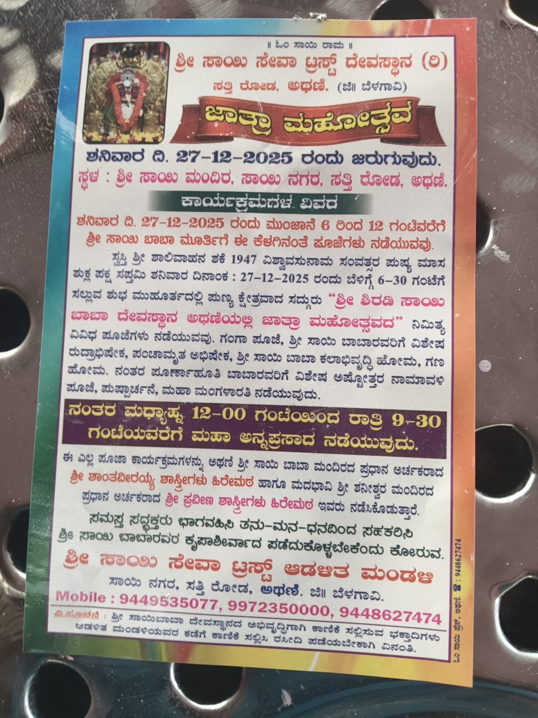 ಬೆಳಗಾವಿ ಜಿಲ್ಲೆ ಅಥಣಿ ತಾಲೂಕಿನಲ್ಲಿ ಸತ್ತಿ ರೋಡ್ ಶ್ರೀ ಸಾಯಿಬಾಬಾ ಜಾತ್ರಾ ಮಹೋತ್ಸವ 27.12.2025 ರಂದು ವಿಜೃಂಭಣೆಯಿಂದ ಅದ್ದೂರಿಯಿಂದ ಜರಗಲಿದೆ || ಓಂ ಸಾಯಿ ರಾಮ ॥ ಶ್ರೀ ಸಾಯಿ
