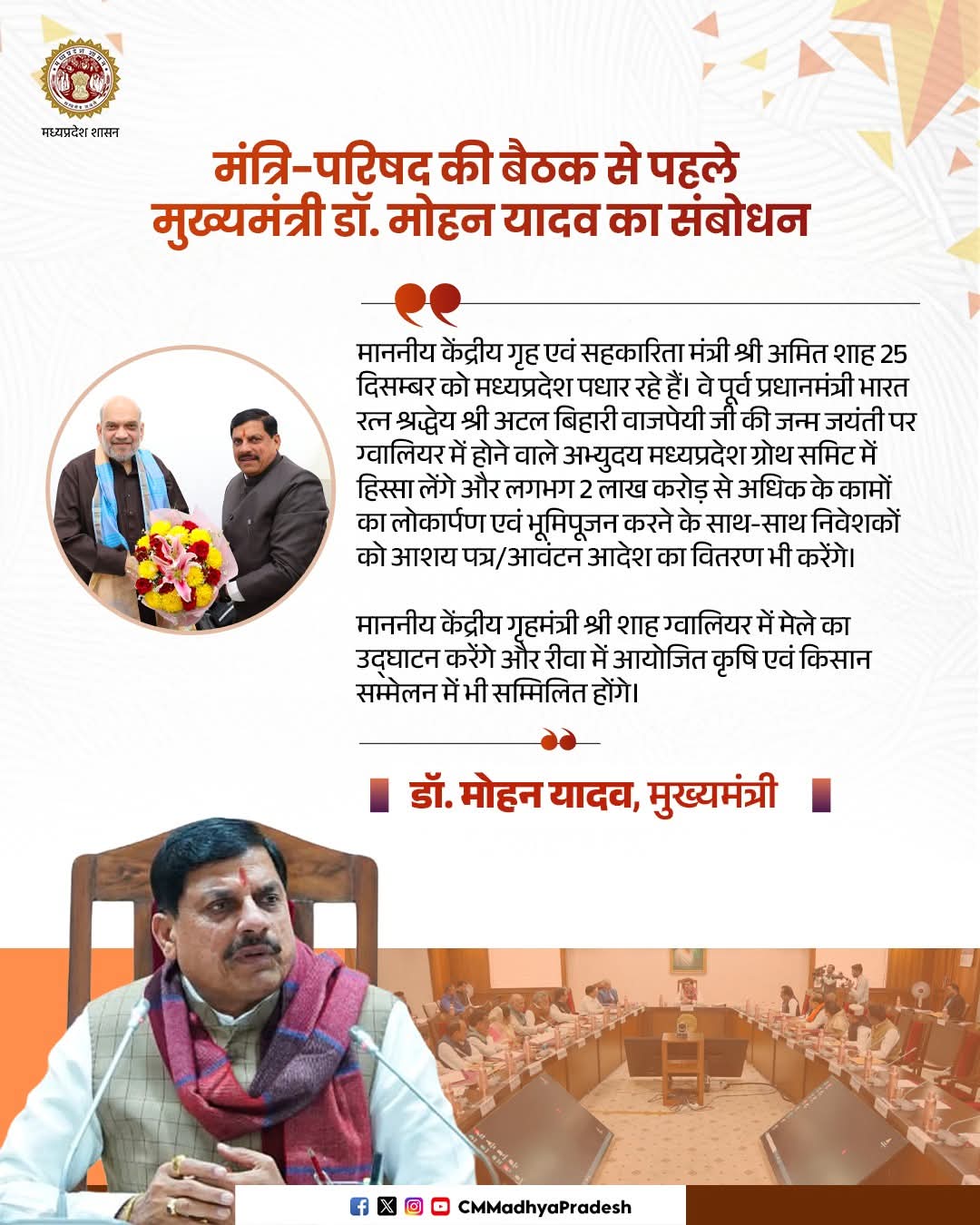 माननीय केंद्रीय गृह एवं सहकारिता मंत्री श्री Amit Shah जी 25 दिसम्बर को मध्यप्रदेश पधार रहे हैं। वे पूर्व प्रधानमंत्री भारत रत्न श्रद्धेय श्री अटल बिहारी वाजपेयी जी की जन्म जयंती पर ग्वालियर में होने वाले अभ्युदय मध्यप्रदेश ग्रोथ समिट में हिस्सा लेंगे और लगभग 2 लाख करोड़ से अधिक के कार्यों का लोकार्पण एवं भूमिपूजन करने के साथ-साथ निवेशकों को आशय पत्र/आवंटन आदेश का वितरण भी करेंगे : CM