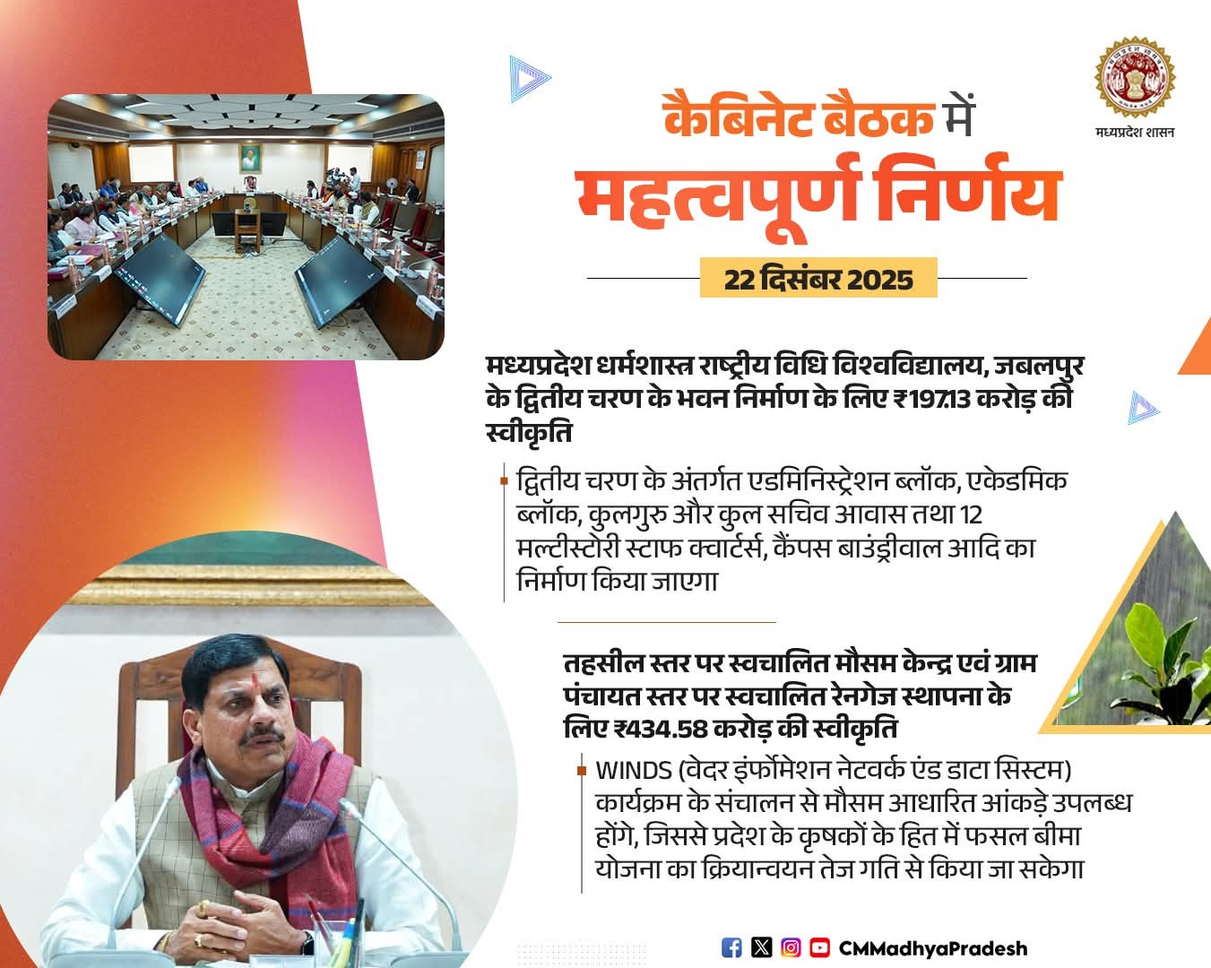 मुख्यमंत्री डॉ मोहन यादव की अध्यक्षता में मध्यप्रदेश कैबिनेट बैठक में लिए गए महत्वपूर्ण निर्णय