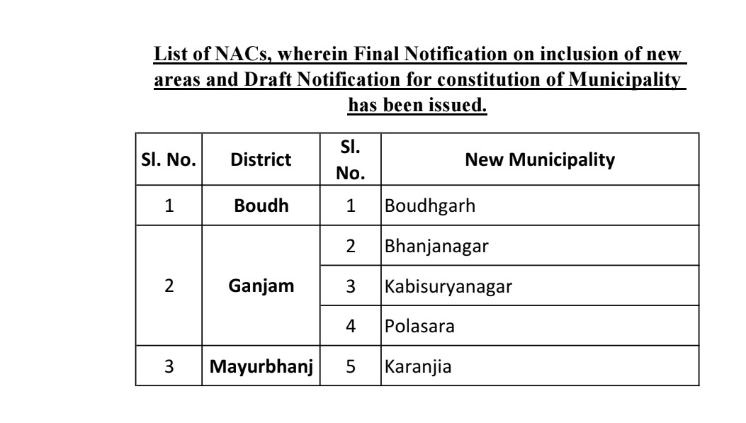 BHUBANESWAR: The Housing & Urban Development (H&UD) Department of Odisha has issued final notifications for the constitution of 24 new Notified Area Councils (NACs) and draft notifications for the upgradation of 5 existing NACs to Municipalities. This major administrative reshuffle aims to decentralize power and extend urban amenities to wider regions of the state.