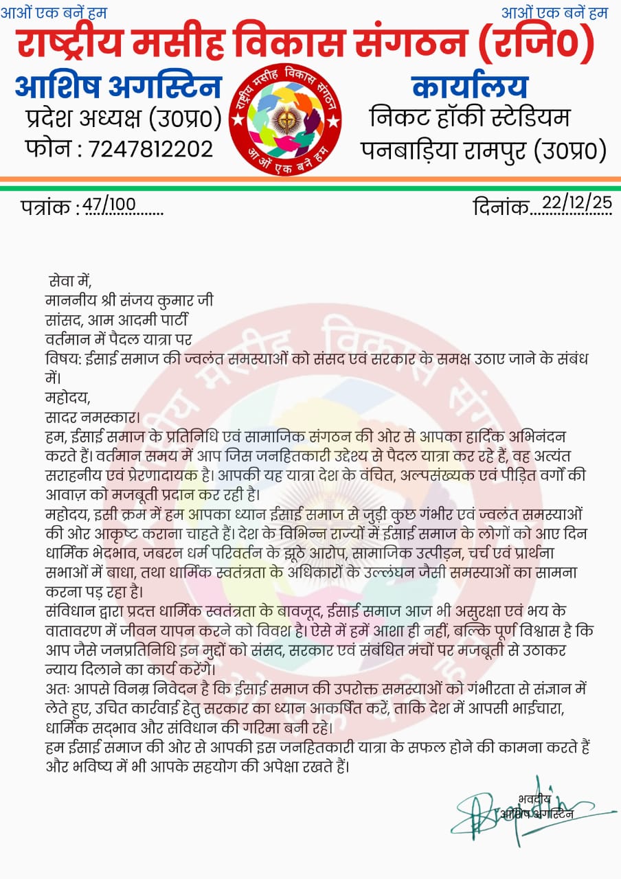 रामपुर न्यूज। 22/12/2025 राष्ट्रीय मसीह विकास संगठन के अध्यक्ष एडवोकेट आशीष अगस्टिन जी द्वारा आम आदमी पार्टी के माननीय सांसद श्री संजय कुमार जी, जो वर्तमान में पैदल यात्रा पर हैं, को ईसाई समाज से जुड़ी विभिन्न ज्वलंत समस्याओं को लेकर एक ज्ञापन सौंपा गया।ज्ञापन के माध्यम से धार्मिक स्वतंत्रता के अधिकार में हो रहे हस्तक्षेप, झूठे धर्मांतरण आरोपों के तहत उत्पीड़न, प्रार्थना सभाओं में बाधा, चर्चों व धार्मिक स्थलों की सुरक्षा का अभाव, ईसाई युवाओं व पास्टरों पर हो रही अनावश्यक पुलिस कार्रवाई, तथा अल्पसंख्यक कल्याण योजनाओं का जमीनी स्तर पर लाभ न मिल पाने जैसी गंभीर समस्याओं को प्रमुखता से रखा।माननीय सांसद जी ने ज्ञापन को गंभीरता से सुना एवं समाज की समस्याओं पर सहानुभूतिपूर्वक विचार करते हुए यह आश्वासन दिया कि ईसाई समाज की आवाज़ को संसद एवं संबंधित मंचों पर पूरी मजबूती के साथ उठाया जाएगा।उन्होंने कहा कि देश के प्रत्येक नागरिक को संविधान प्रदत्त धार्मिक स्वतंत्रता और सम्मान के साथ जीवन जीने का अधिकार है तथा किसी भी समुदाय के साथ अन्याय स्वीकार्य नहीं है।आइमा मीडिया संवाददाता- प्रेम मसीह