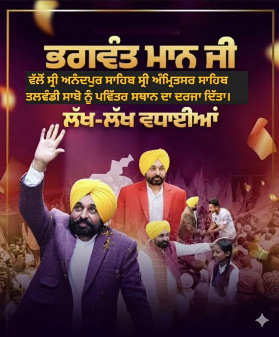 पंजाब की मान सरकार ने राज्य के आध्यात्मिक और सांस्कृतिक इतिहास में एक नया अध्याय जोड़ते हुए एक बड़ा और ऐतिहासिक निर्णय लिया है। सिख समुदाय की भावनाओं और इन नगरों की गरिमा को सर्वोपरि रखते हुए, सरकार ने पंजाब में स्थित तीन प्रमुख तख्त साहिबान के शहरों— श्री अमृतसर साहिब, श्री आनंदपुर साहिब और तलवंडी साबो (श्री दमदमा साहिब) को पूर्ण रूप से 'पवित्र शहर' (Holy Cities) का दर्जा दे दिया है।