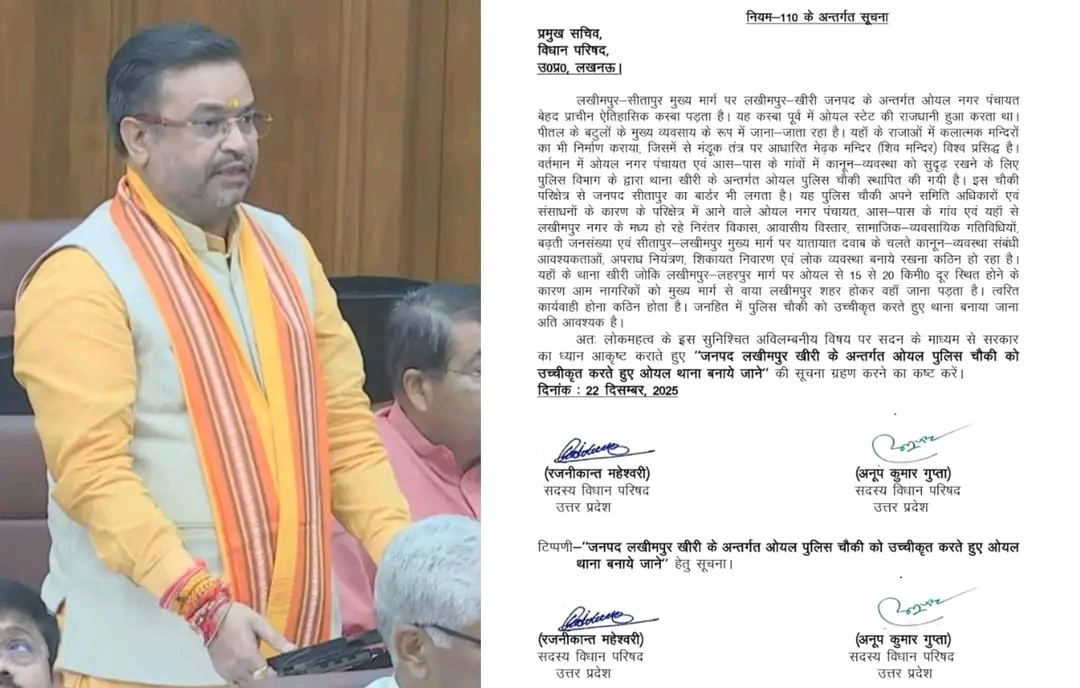ओयल चौकी थाने में परिवर्तित! विधान परिषद उच्च सदन के शीतकालीन सत्र में नियम 110 के अंतर्गत "जनपद लखीमपुर खीरी के अन्तर्गत ओयल पुलिस चौकी को उच्चीकृत करते हुए ओयल थाना बनाये जाने" की सूचना सरकार को एमएलसी अनूप गुप्ता ने दी!