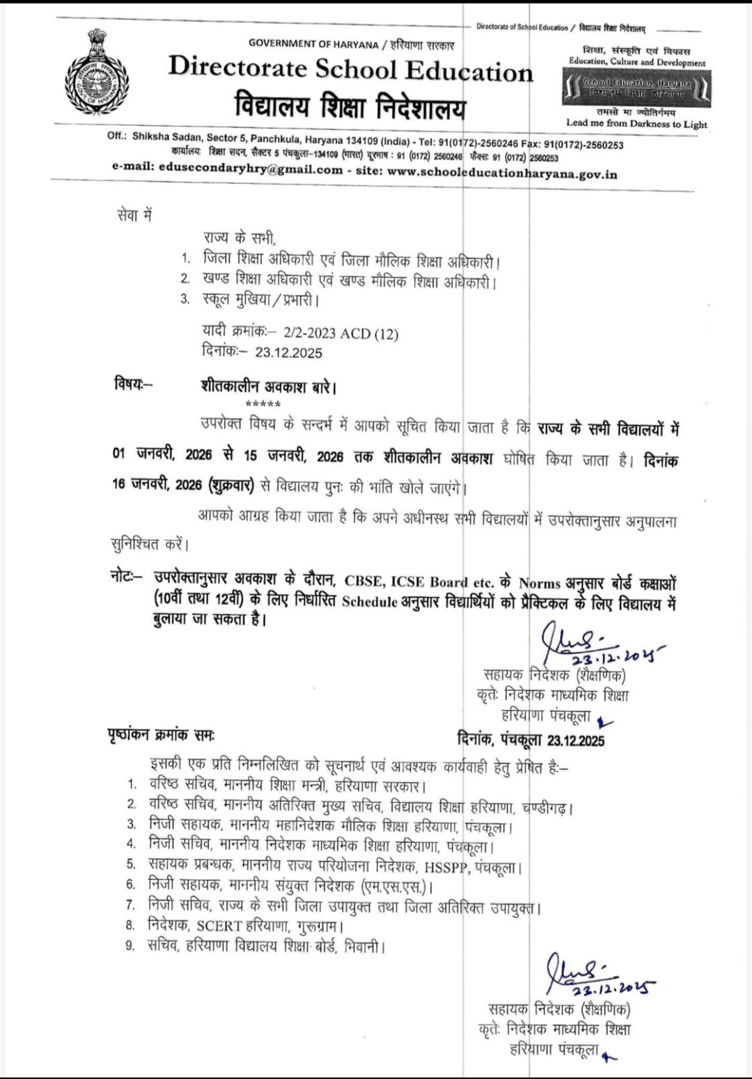 हरियाणा के स्कूलों की 1 जनवरी सें 15 जनवरी तक छुटीयां