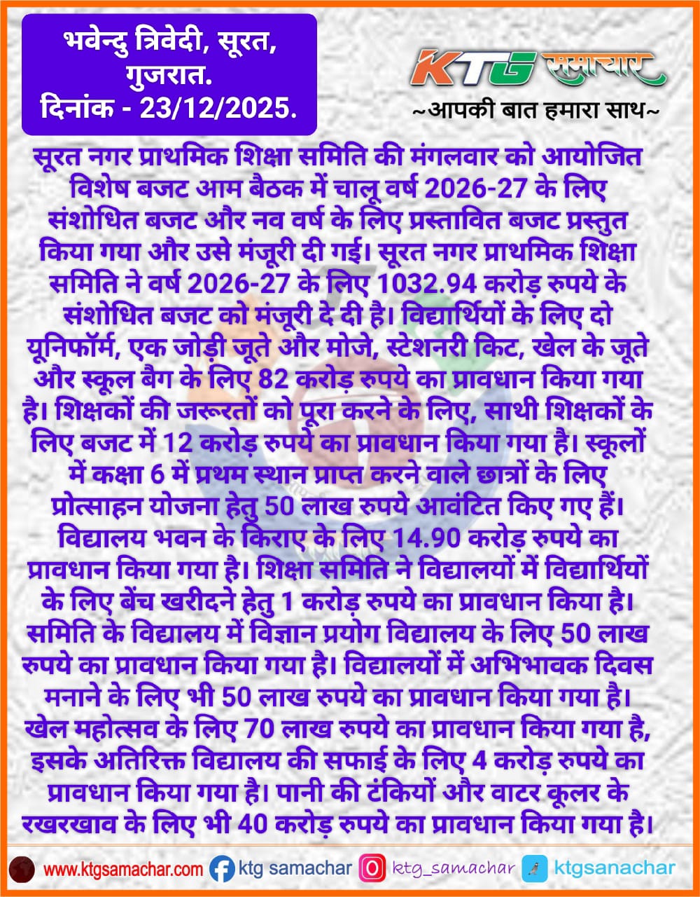 सूरत नगर प्राथमिक शिक्षा समिति ने वर्ष 2026-27 के लिए 1032.94 करोड रुपए के संशोधित बजट को मंजूरी दे दी है।