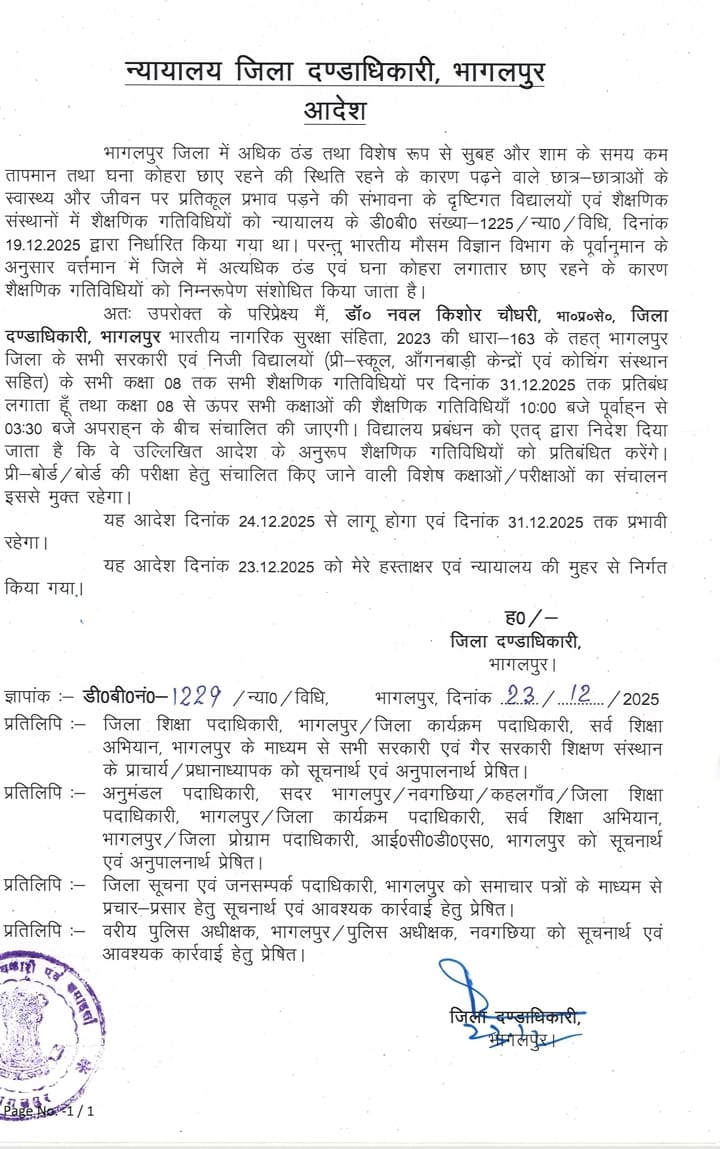 भागलपुर जिला अंतर्गत सभी सरकारी एवं गैर सरकारी विद्यालय वर्ग 1 से 8 तक सभी विद्यालय का शैक्षणिक कार्य 31 दिसंबर तक बंद रहेंगे वहीं 9 वर्ग से ऊपर की कक्षाएं का संचालन 10:00 से 3:30 बजे तक चलेगा आदेशानुसार - जिला पदाधिकारी