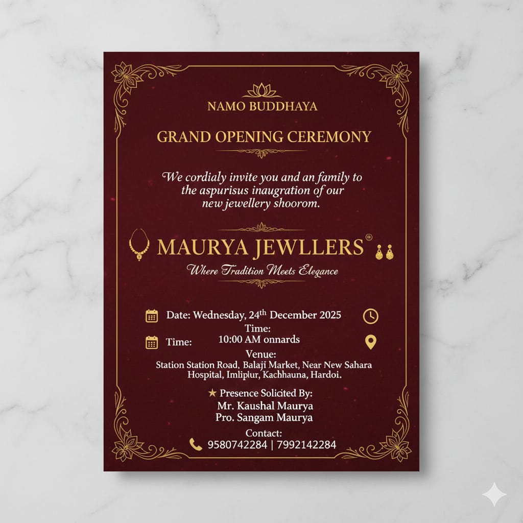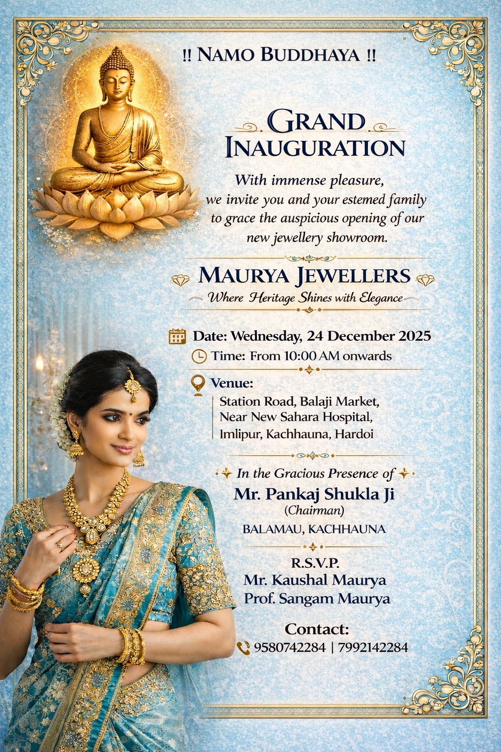 कछौना (हरदोई) नगर क्षेत्र के स्टेशन रोड, न्यू सहारा हॉस्पिटल के सामने स्थित मौर्य ज्वैलर्स के नवीन आभूषण शोरूम का भव्य शुभारंभ कल बुधवार, 24 दिसम्बर 2025 को प्रातः 10:00 बजे किया जाएगा।
