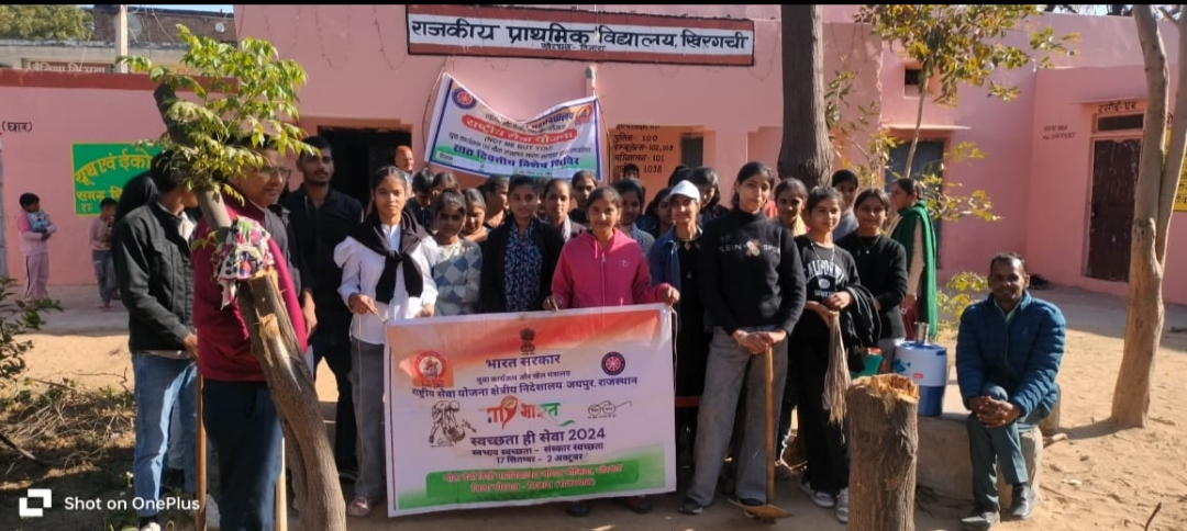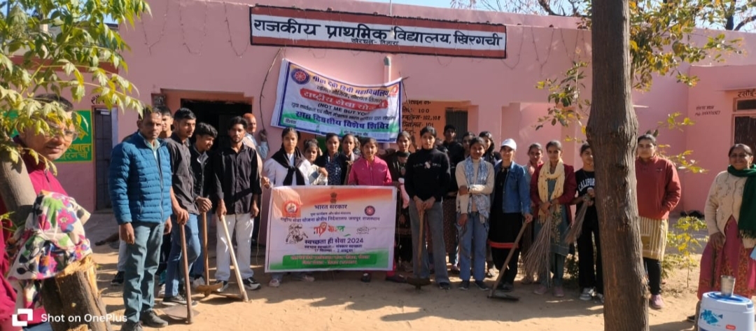 शहर के समीपवर्ती गीता देवी डिग्री कॉलेज नांगल मौजिया खैरथल में राष्ट्रीय सेवा योजना के सात दिवसीय विशेष शिविर के तृतीय दिवस पर स्वच्छ भारत अभियान के तहत गोद ली गई बस्ती खिराची में तथा राजकीय प्राथमिक विद्यालय के परिसर मे स्वयं सेवक व सेविकाओं द्वारा श्रमदान किया गया एवम् भारत को कचरा मुक्त बनाने की शपथ ली गई ।