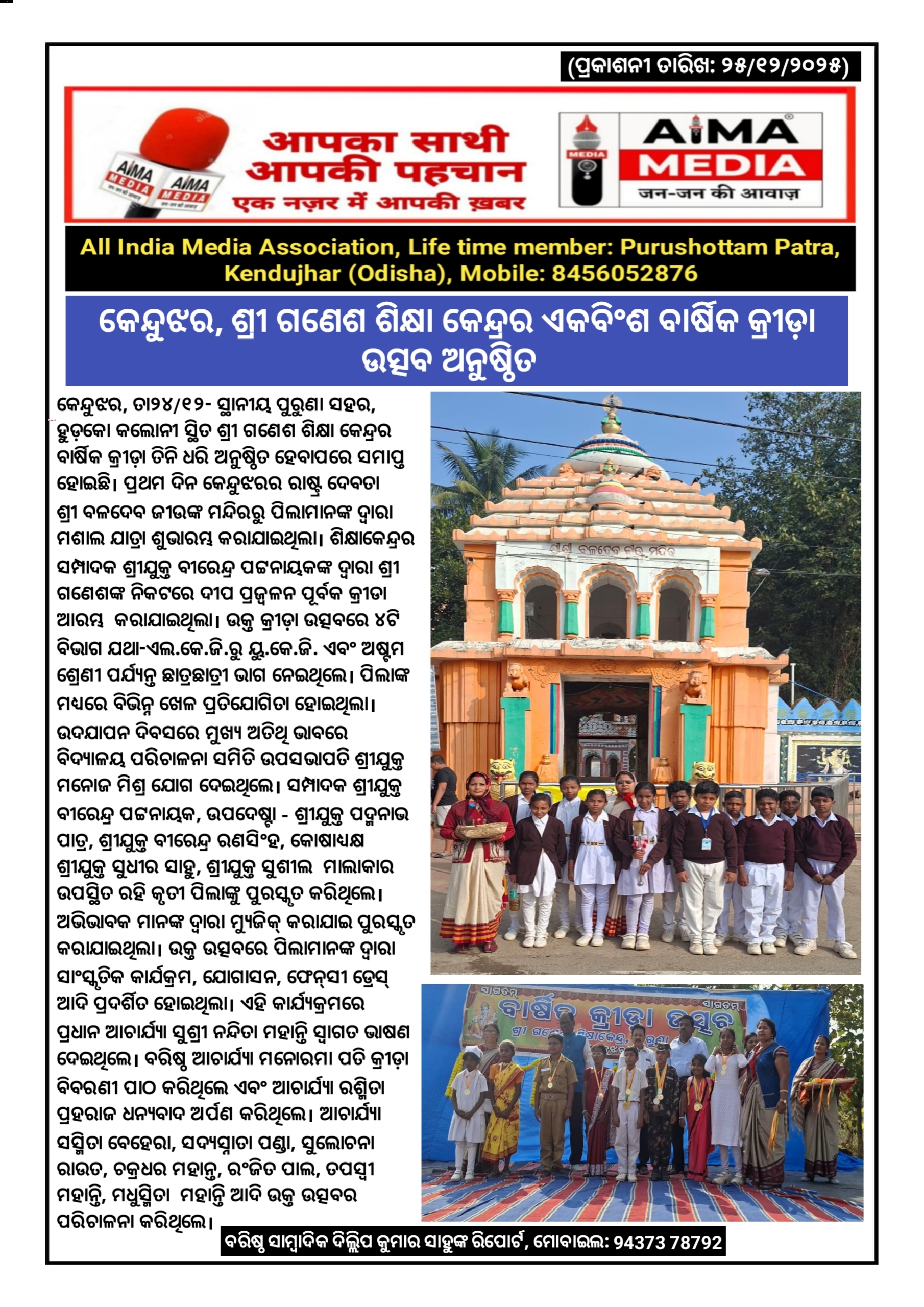 କେନ୍ଦୁଝର, ତା୨୪/୧୨- ସ୍ଥାନୀୟ ପୁରୁଣା ସହର, ହୁଡ଼କୋ କଲୋନୀ ସ୍ଥିତ ଶ୍ରୀ ଗଣେଶ ଶିକ୍ଷା କେନ୍ଦ୍ରର ବାର୍ଷିକ କ୍ରୀଡ଼ା ତିନି ଧରି ଅନୁଷ୍ଠିତ ହେବାପରେ ସମାପ୍ତ ହୋଇଛି। ପ୍ରଥମ ଦିନ କେନ୍ଦୁଝରର ରାଷ୍ଟ୍ର ଦେବତା ଶ୍ରୀ ବଳଦେବ ଜୀଉଙ୍କ ମନ୍ଦିରରୁ ପିଲାମାନଙ୍କ ଦ୍ଵାରା ମଶାଲ ଯାତ୍ରା ଶୁଭାରମ୍ଭ କରାଯାଇଥିଲା। ଶିକ୍ଷାକେନ୍ଦ୍ରର ସମ୍ପାଦକ ଶ୍ରୀଯୁକ୍ତ ବୀରେନ୍ଦ୍ର ପଟ୍ଟନାୟକଙ୍କ ଦ୍ଵାରା ଶ୍ରୀ ଗଣେଶଙ୍କ ନିକଟରେ ଦୀପ ପ୍ରଜ୍ବଳନ ପୂର୍ବକ କ୍ରୀଡା ଆରମ୍ଭ କରାଯାଇଥିଲା। ଉକ୍ତ କ୍ରୀଡ଼ା ଉତ୍ସବରେ ୪ଟି ବିଭାଗ ଯଥା- ଏଲ.କେ.ଜି.ରୁ ୟୁ.କେ.ଜି. ଏବଂ ଅଷ୍ଟମ ଶ୍ରେଣୀ ପର୍ଯ୍ୟନ୍ତ ଛାତ୍ରଛାତ୍ରୀ ଭାଗ ନେଇଥିଲେ। ପିଲାଙ୍କ ମଧ୍ୟରେ ବିଭିନ୍ନ ଖେଳ ପ୍ରତିଯୋଗିତା ହୋଇଥିଲା। ଉଦଯାପନ ଦିବସରେ ମୁଖ୍ୟ ଅତିଥି ଭାବରେ ବିଦ୍ୟାଳୟ ପରିଚାଳନା ସମିତି ଉପସଭାପତି ଶ୍ରୀଯୁକ୍ତ ମନୋଜ ମିଶ୍ର ଯୋଗ ଦେଇଥିଲେ। ସମ୍ପାଦକ ଶ୍ରୀଯୁକ୍ତ ବୀରେନ୍ଦ୍ର ପଟ୍ଟନାୟକ, ଉପଦେଷ୍ଟା - ଶ୍ରୀଯୁକ୍ତ ପଦ୍ମନାଭ ପାତ୍ର, ଶ୍ରୀଯୁକ୍ତ ବୀରେନ୍ଦ୍ର ରଣସିଂହ, କୋଷାଧ୍ୟକ୍ଷ ଶ୍ରୀଯୁକ୍ତ ସୁଧୀର ସାହୁ, ଶ୍ରୀଯୁକ୍ତ ସୁଶୀଲ ମାଲାକାର ଉପସ୍ଥିତ ରହି କୃତୀ ପିଲାଙ୍କୁ ପୁରସ୍କୃତ କରିଥିଲେ। ଅଭିଭାବକ ମାନଙ୍କ ଦ୍ଵାରା ମ୍ୟୁଜିକ୍‌ କରାଯାଇ ପୁରସ୍କୃତ କରାଯାଇଥିଲା। ଉକ୍ତ ଉତ୍ସବରେ ପିଲାମାନଙ୍କ ଦ୍ଵାରା ସାଂସ୍କୃତିକ କାର୍ଯକ୍ରମ, ଯୋଗାସନ, ଫେନ୍‌ସୀ ଡ୍ରେସ୍‌ ଆଦି ପ୍ରଦର୍ଶିତ ହୋଇଥିଲା। ଏହି କାର୍ଯ୍ୟକ୍ରମରେ ପ୍ରଧାନ ଆଚାର୍ଯ୍ୟା ସୁଶ୍ରୀ ନନ୍ଦିତା ମହାନ୍ତି ସ୍ବାଗତ ଭାଷଣ ଦେଇଥିଲେ। ବରିଷ୍ଠ ଆଚାର୍ଯ୍ୟା ମନୋରମା ପତି କ୍ରୀଡ଼ା ବିବରଣୀ ପାଠ କରିଥିଲେ ଏବଂ ଆଚାର୍ଯ୍ୟା ରଶ୍ମିତା ପ୍ରହରାଜ ଧନ୍ୟବାଦ ଅର୍ପଣ କରିଥିଲେ। ଆଚାର୍ଯ୍ୟା ସସ୍ମିତା ବେହେରା, ସଦ୍ୟସ୍ନାତା ପଣ୍ଡା, ସୁଲୋଚନା ରାଉତ, ଚକ୍ରଧର ମହାନ୍ତ, ରଂଜିତ ପାଲ, ତପସ୍ୱୀ ମହାନ୍ତି, ମଧୁସ୍ମିତା ମହାନ୍ତି ଆଦି ଉକ୍ତ ଉତ୍ସବର ପରିଚାଳନା କରିଥିଲେ।