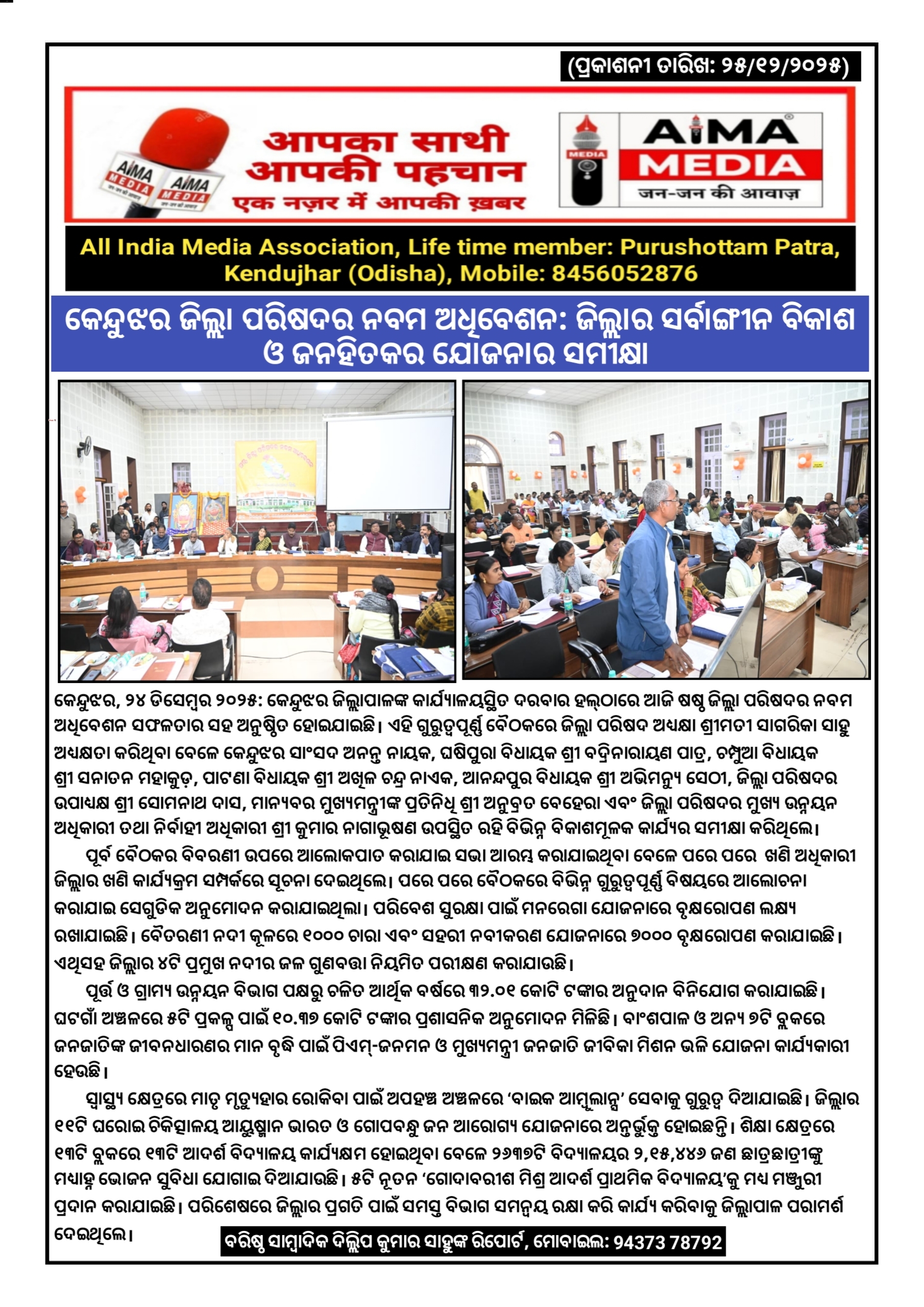କେନ୍ଦୁଝର ଜିଲ୍ଲା ପରିଷଦର ନବମ ଅଧିବେଶନ: ଜିଲ୍ଲାର ସର୍ବାଙ୍ଗୀନ ବିକାଶ ଓ ଜନହିତକର ଯୋଜନାର ସମୀକ୍ଷା।