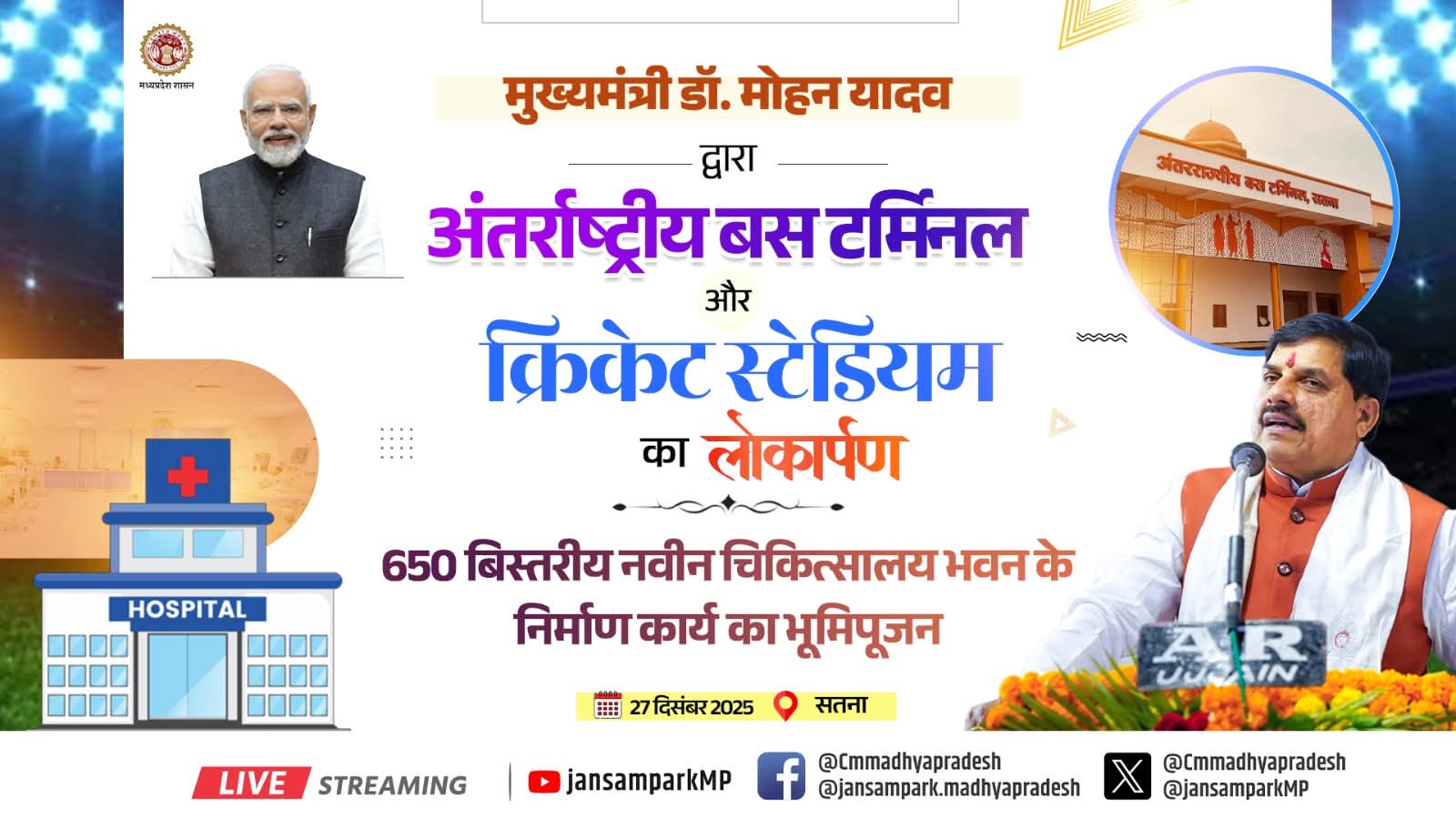 मुख्यमंत्री डॉ. मोहन यादव द्वारा अंतर्राष्ट्रीय बस टर्मिनल एवं क्रिकेट स्टेडियम का लोकार्पण एवं 650 बिस्तरीय नवीन चिकित्सालय भवन निर्माण कार्य का भूमिपूजन