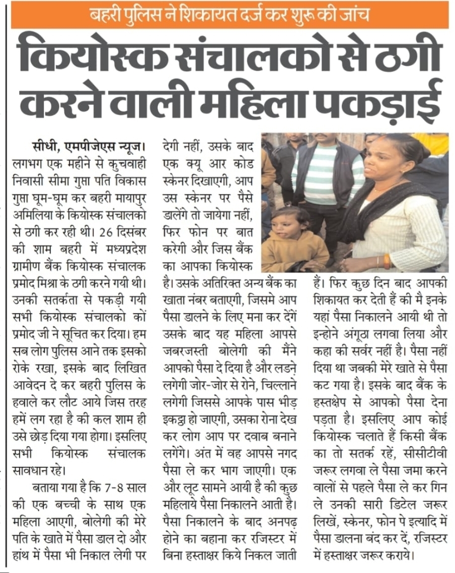 लगभग एक महीने से कुचवाही निवासी सीमा गुप्ता पति विकास गुप्ता घूम-घूम कर बहरी मायापुर अमिलिया के कियोस्क संचालको से ठगी कर रही थी। 26 दिसंबर की शाम बहरी में मध्यप्रदेश ग्रामीण बैंक कियोस्क संचालक प्रमोद मिश्रा के ठगी करने गयी थी। उनकी सतर्कता से पकड़ी गयी सभी कियोस्क संचालको कों प्रमोद जी ने सूचित कर दिया। हम सब लोग पुलिस आने तक इसको रोके रखा, इसके बाद लिखित आवेदन दे कर बहरी पुलिस के हवाले कर लौट आये जिस तरह हमें लग रहा है की कल शाम ही उसे छोड़ दिया गया होगा। इसलिए सभी कियोस्क संचालक सावधान रहे।