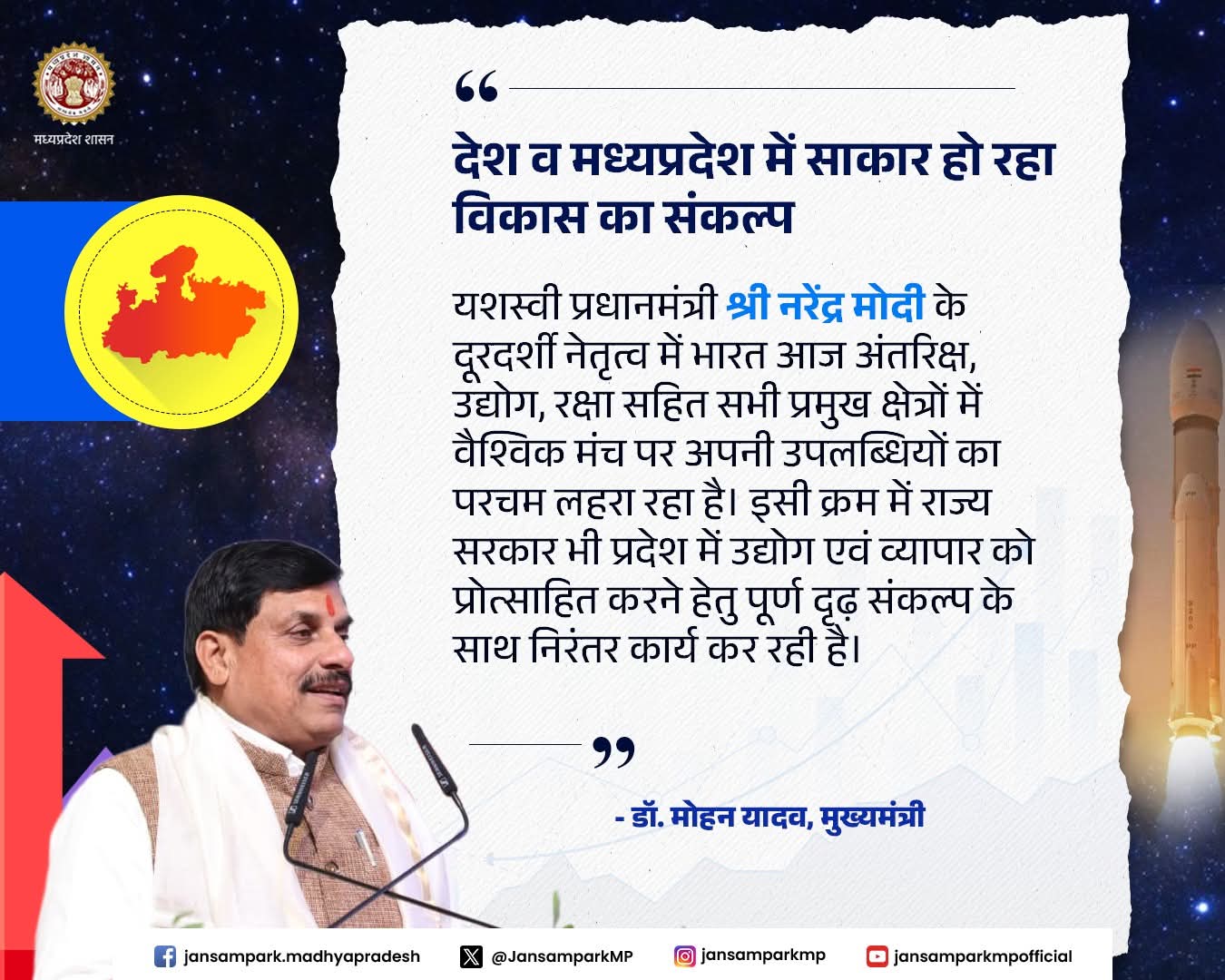 यशस्वी प्रधानमंत्री श्री नरेंद्र मोदी के दूरदर्शी नेतृत्व में भारत आज अंतरिक्ष, उद्योग, रक्षा सहित सभी प्रमुख क्षेत्रों में वैश्विक मंच पर अपनी उपलब्धियों का परचम लहरा रहा है। इसी क्रम में राज्य सरकार भी प्रदेश में उद्योग एवं व्यापार को प्रोत्साहित करने हेतु पूर्ण दृढ़ संकल्प के साथ निरंतर कार्य कर रही है।