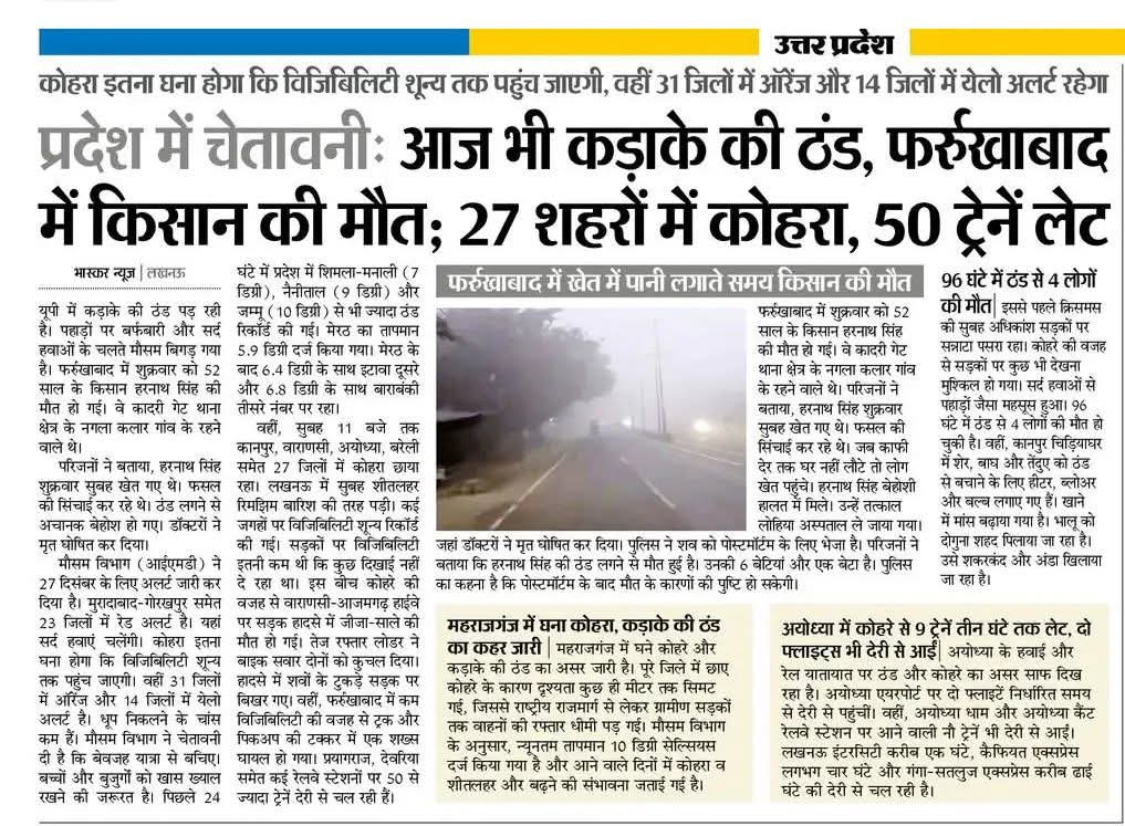 उत्तरप्रदेश में चेतावनी: कड़ाके की ठंड, फर्रुखाबाद में किसान की मौत, 27 शहरों में कोहरा, 50 ट्रेनें लेट