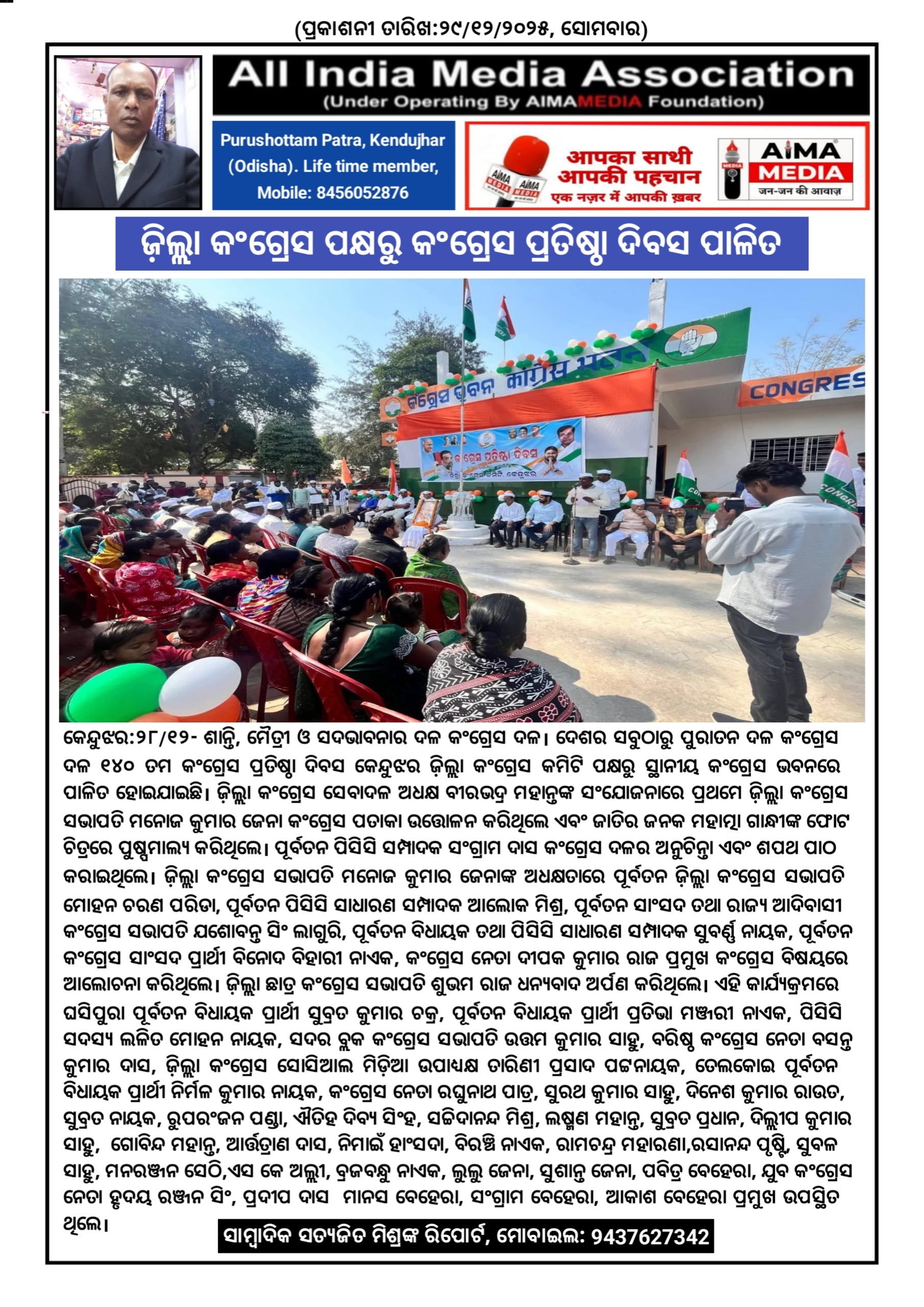 କେନ୍ଦୁଝର:୨୮/୧୨, ଶାନ୍ତି, ମୈତ୍ରୀ ଓ ସଦଭାବନାର ଦଳ କଂଗ୍ରେସ ଦଳ l ଦେଶର ସବୁଠାରୁ ପୁରାତନ ଦଳ କଂଗ୍ରେସ ଦଳ ୧୪୦ ତମ କଂଗ୍ରେସ ପ୍ରତିଷ୍ଠା ଦିବସ କେନ୍ଦୁଝର ଜ଼ିଲ୍ଲା କଂଗ୍ରେସ କମିଟି ପକ୍ଷରୁ ସ୍ଥାନୀୟ କଂଗ୍ରେସ ଭବନରେ ପାଳିତ ହୋଇଯାଇଛି l ଜ଼ିଲ୍ଲା କଂଗ୍ରେସ ସେବାଦଳ ଅଧକ୍ଷ ବୀରଭଦ୍ର ମହାନ୍ତଙ୍କ ସଂଯୋଜନାରେ ପ୍ରଥମେ ଜ଼ିଲ୍ଲା କଂଗ୍ରେସ ସଭାପତି ମନୋଜ କୁମାର ଜେନା କଂଗ୍ରେସ ପତାକା ଉତ୍ତୋଳନ କରିଥିଲେ ଏବଂ ଜାତିର ଜନକ ମହାତ୍ମା ଗାନ୍ଧୀଙ୍କ ଫୋଟ ଚିତ୍ରରେ ପୁଷ୍ପମାଲ୍ୟ କରିଥିଲେ l ପୂର୍ବତନ ପିସିସି ସମ୍ପାଦକ ସଂଗ୍ରାମ ଦାସ କଂଗ୍ରେସ ଦଳର ଅନୁଚିନ୍ତା ଏବଂ ଶପଥ ପାଠ କରାଇଥିଲେ l ଜ଼ିଲ୍ଲା କଂଗ୍ରେସ ସଭାପତି ମନୋଜ କୁମାର ଜେନାଙ୍କ ଅଧକ୍ଷତାରେ ପୂର୍ବତନ ଜ଼ିଲ୍ଲା କଂଗ୍ରେସ ସଭାପତି ମୋହନ ଚରଣ ପରିଡା, ପୂର୍ବତନ ପିସିସି ସାଧାରଣ ସମ୍ପାଦକ ଆଲୋକ ମିଶ୍ର, ପୂର୍ବତନ ସାଂସଦ ତଥା ରାଜ୍ୟ ଆଦିବାସୀ କଂଗ୍ରେସ ସଭାପତି ଯଶୋବନ୍ତ ସିଂ ଲାଗୁରି, ପୂର୍ବତନ ବିଧାୟକ ତଥା ପିସିସି ସାଧାରଣ ସମ୍ପାଦକ ସୁବର୍ଣ୍ଣ ନାୟକ, ପୂର୍ବତନ କଂଗ୍ରେସ ସାଂସଦ ପ୍ରାର୍ଥୀ ବିନୋଦ ବିହାରୀ ନାଏକ, କଂଗ୍ରେସ ନେତା ଦୀପକ କୁମାର ରାଜ ପ୍ରମୁଖ କଂଗ୍ରେସ ବିଷୟରେ ଆଲୋଚନା କରିଥିଲେ l ଜ଼ିଲ୍ଲା ଛାତ୍ର କଂଗ୍ରେସ ସଭାପତି ଶୁଭମ ରାଜ ଧନ୍ୟବାଦ ଅର୍ପଣ କରିଥିଲେ l ଏହି କାର୍ଯ୍ୟକ୍ରମରେ ଘସିପୁରା ପୂର୍ବତନ ବିଧାୟକ ପ୍ରାର୍ଥୀ ସୁବ୍ରତ କୁମାର ଚକ୍ର, ପୂର୍ବତନ ବିଧାୟକ ପ୍ରାର୍ଥୀ ପ୍ରତିଭା ମଞ୍ଜରୀ ନାଏକ, ପିସିସି ସଦସ୍ୟ ଲଳିତ ମୋହନ ନାୟକ, ସଦର ବ୍ଲକ କଂଗ୍ରେସ ସଭାପତି ଉତ୍ତମ କୁମାର ସାହୁ, ବରିଷ୍ଠ କଂଗ୍ରେସ ନେତା ବସନ୍ତ କୁମାର ଦାସ, ଜ଼ିଲ୍ଲା କଂଗ୍ରେସ ସୋସିଆଲ ମିଡ଼ିଆ ଉପାଧ୍ୟକ୍ଷ ତାରିଣୀ ପ୍ରସାଦ ପଟ୍ଟନାୟକ, ତେଲକୋଇ ପୂର୍ବତନ ବିଧାୟକ ପ୍ରାର୍ଥୀ ନିର୍ମଳ କୁମାର ନାୟକ, କଂଗ୍ରେସ ନେତା ରଘୁନାଥ ପାତ୍ର, ସୁରଥ କୁମାର ସାହୁ, ଦିନେଶ କୁମାର ରାଉତ, ସୁବ୍ରତ ନାୟକ, ରୁପରଂଜନ ପଣ୍ଡା, ଐତିହ ଦିବ୍ୟ ସିଂହ, ସଚ୍ଚିଦାନନ୍ଦ ମିଶ୍ର, ଲଷ୍ମଣ ମହାନ୍ତ, ସୁବ୍ରତ ପ୍ରଧାନ, ଦିଲ୍ଲୀପ କୁମାର ସାହୁ, ଗୋବିନ୍ଦ ମହାନ୍ତ, ଆର୍ତ୍ତତ୍ରାଣ ଦାସ, ନିମାଇଁ ହାଂସଦା, ବିରଞ୍ଚି ନାଏକ, ରାମଚନ୍ଦ୍ର ମହାରଣା,ରସାନନ୍ଦ ପୃଷ୍ଟି, ସୁବଳ ସାହୁ, ମନରଞ୍ଜନ ସେଠି,ଏସ କେ ଅଲ୍ଲୀ, ବ୍ରଜବନ୍ଧୁ ନାଏକ, ଲୁଲୁ ଜେନା, ସୁଶାନ୍ତ ଜେନା, ପବିତ୍ର ବେହେରା, ଯୁବ କଂଗ୍ରେସ ନେତା ହୃଦୟ ରଞ୍ଜନ ସିଂ, ପ୍ରଦୀପ ଦାସ ମାନସ ବେହେରା, ସଂଗ୍ରାମ ବେହେରା, ଆକାଶ ବେହେରା ପ୍ରମୁଖ ଉପସ୍ଥିତ ଥିଲେ l