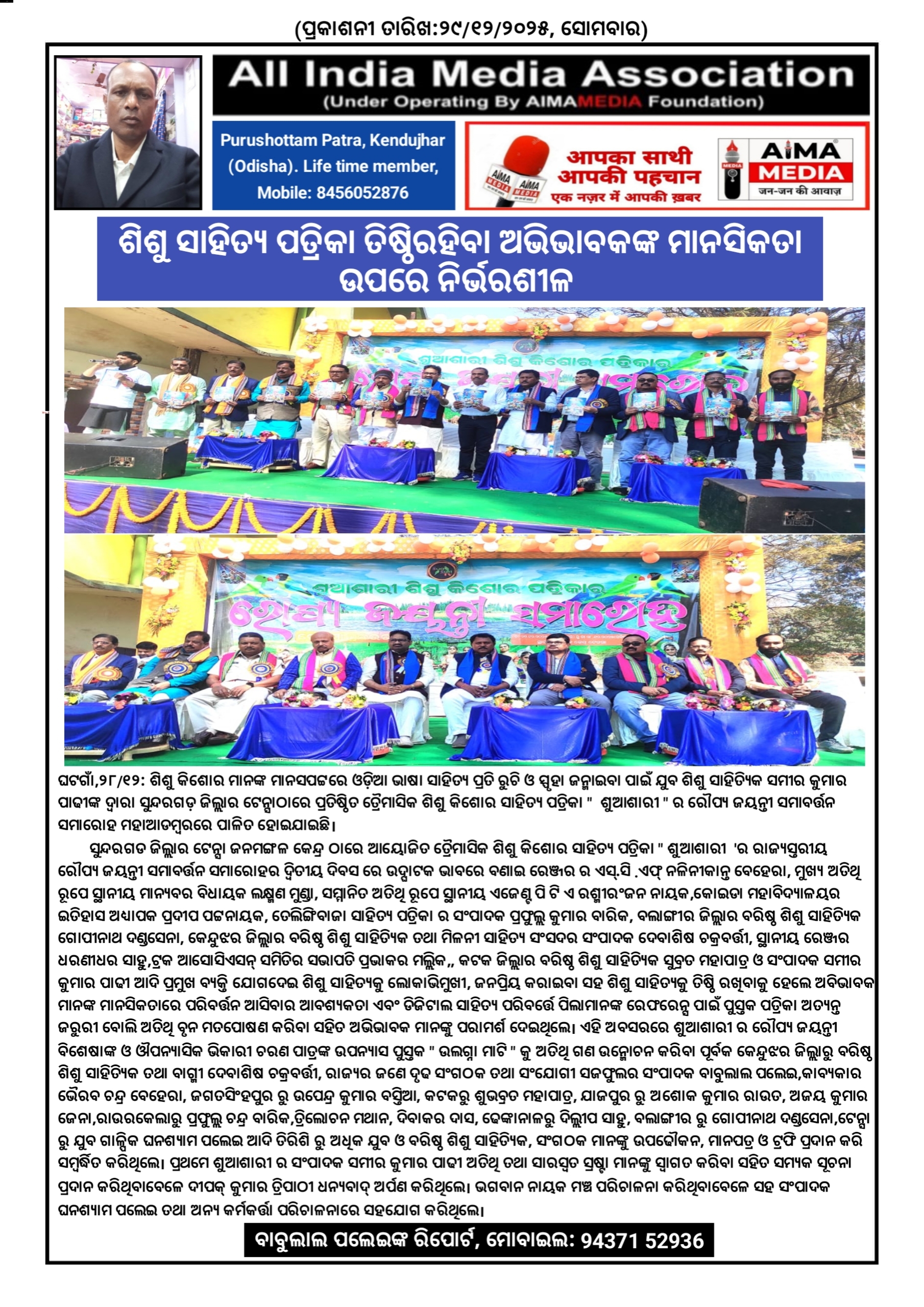 ଘଟଗାଁ,୨୮/୧୨: ଶିଶୁ କିଶୋର ମାନଙ୍କ ମାନସପଟ୍ଟରେ ଓଡ଼ିଆ ଭାଷା ସାହିତ୍ୟ ପ୍ରତି ରୁଚି ଓ ସ୍ପୃହା ଜନ୍ମାଇବା ପାଇଁ ଯୁବ ଶିଶୁ ସାହିତ୍ୟିକ ସମୀର କୁମାର ପାଢୀଙ୍କ ଦ୍ବାରା ସୁନ୍ଦରଗଡ଼ ଜିଲ୍ଲାର ଟେନ୍ସାଠାରେ ପ୍ରତିଷ୍ଠିତ ତ୍ରୈମାସିକ ଶିଶୁ କିଶୋର ସାହିତ୍ୟ ପତ୍ରିକା " ଶୁଆଶାରୀ " ର ରୌପ୍ୟ ଜୟନ୍ତୀ ସମାବର୍ତ୍ତନ ସମାରୋହ ମହାଆଡମ୍ବରରେ ପାଳିତ ହୋଇଯାଇଛି।