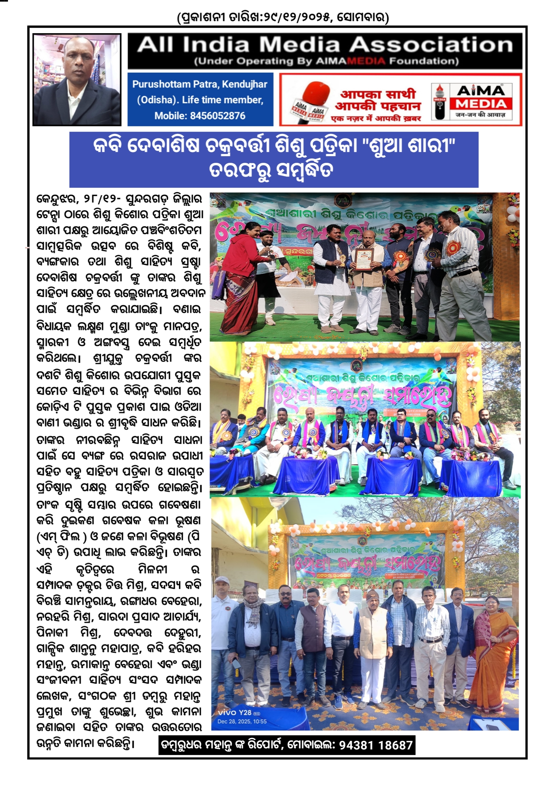 କେନ୍ଦୁଝର ତା ୨୮/୧୨- ସୁନ୍ଦରଗଡ଼ ଜିଲ୍ଲାର ଟେନ୍ସା ଠାରେ ଶିଶୁ କିଶୋର ପତ୍ରିକା ଶୁଆ ଶାରୀ ପକ୍ଷରୁ ଆୟୋଜିତ ପଞ୍ଚବିଂଶତିତମ ସାମ୍ବତ୍ସରିକ ଉତ୍ସବ ରେ ବିଶିଷ୍ଟ କବି, ବ୍ୟଙ୍ଗକାର ତଥା ଶିଶୁ ସାହିତ୍ୟ ସ୍ରଷ୍ଟା ଦେବାଶିଷ ଚକ୍ରବର୍ତ୍ତୀ ଙ୍କୁ ତାଙ୍କର ଶିଶୁ ସାହିତ୍ୟ କ୍ଷେତ୍ର ରେ ଉଲ୍ଲେଖନୀୟ ଅବଦାନ ପାଇଁ ସମ୍ବର୍ଦ୍ଧିତ କରାଯାଇଛି। ବଣାଇ ବିଧାୟକ ଲକ୍ଷ୍ମଣ ମୁଣ୍ଡା ତାଂକୁ ମାନପତ୍ର, ସ୍ମାରକୀ ଓ ଅଙ୍ଗବସ୍ତ୍ର ଦେଇ ସମ୍ବର୍ଧିତ କରିଥଲେ। ଶ୍ରୀଯୁକ୍ତ ଚକ୍ରବର୍ତ୍ତୀ ଙ୍କର ଦଶଟି ଶିଶୁ କିଶୋର ଉପଯୋଗୀ ପୁସ୍ତକ ସମେତ ସାହିତ୍ୟ ର ବିଭିନ୍ନ ବିଭାଗ ରେ କୋଡ଼ିଏ ଟି ପୁସ୍ତକ ପ୍ରକାଶ ପାଇ ଓଡିଆ ବାଣୀ ଭଣ୍ଡାର ର ଶ୍ରୀବୃଦ୍ଧି ସାଧନ କରିଛି। ତାଙ୍କର ନୀରବଛିନ୍ନ ସାହିତ୍ୟ ସାଧନା ପାଇଁ ସେ ବ୍ୟଙ୍ଗ ରେ ରସରାଜ ଉପାଧୀ ସହିତ ବହୁ ସାହିତ୍ୟ ପତ୍ରିକା ଓ ସାରସ୍ୱତ ପ୍ରତିଷ୍ଠାନ ପକ୍ଷରୁ ସମ୍ବର୍ଦ୍ଧିତ ହୋଇଛନ୍ତି। ତାଂକ ସୃଷ୍ଟି ସମ୍ଭାର ଉପରେ ଗବେଷଣା କରି ଦୁଇକଣ ଗବେଷକ କଳା ଭୂଷଣ (ଏମ୍ ଫିଲ ) ଓ ଜଣେ କଳା ବିଭୂଷଣ (ପି ଏଚ୍ ଡି) ଉପାଧି ଲାଭ କରିଛନ୍ତି। ତାଙ୍କର ଏହି କୃତିତ୍ୱରେ ମିଳନୀ ର ସମ୍ପାଦକ ଡ଼କ୍ଟର ଚିତ୍ତ ମିଶ୍ର, ସଦସ୍ୟ କବି ବିରଞ୍ଚି ସାମନ୍ତରାୟ, ରଙ୍ଗାଧର ବେହେରା, ନରହରି ମିଶ୍ର, ସାରଦା ପ୍ରସାଦ ଆଚାର୍ଯ୍ୟ, ପିନାକୀ ମିଶ୍ର, ଦେବଦତ୍ତ ଦେହୁରୀ, ଗାଳ୍ପିକ ଶାନ୍ତନୁ ମହାପାତ୍ର, କବି ହରିହର ମହାନ୍ତ, ଉମାକାନ୍ତ ବେହେରା ଏବଂ ଭଣ୍ଡା ସଂଜୀବନୀ ସାହିତ୍ୟ ସଂସଦ ସମ୍ପାଦକ ଲେଖକ, ସଂଗଠକ ଶ୍ରୀ ଡମ୍ବରୁ ମହାନ୍ତ ପ୍ରମୁଖ ତାଙ୍କୁ ଶୁଭେଚ୍ଛା, ଶୁଭ କାମନା ଜଣାଇବା ସହିତ ତାଙ୍କର ଉତ୍ତରତୋର ଉନ୍ନତି କାମନା କରିଛନ୍ତି l