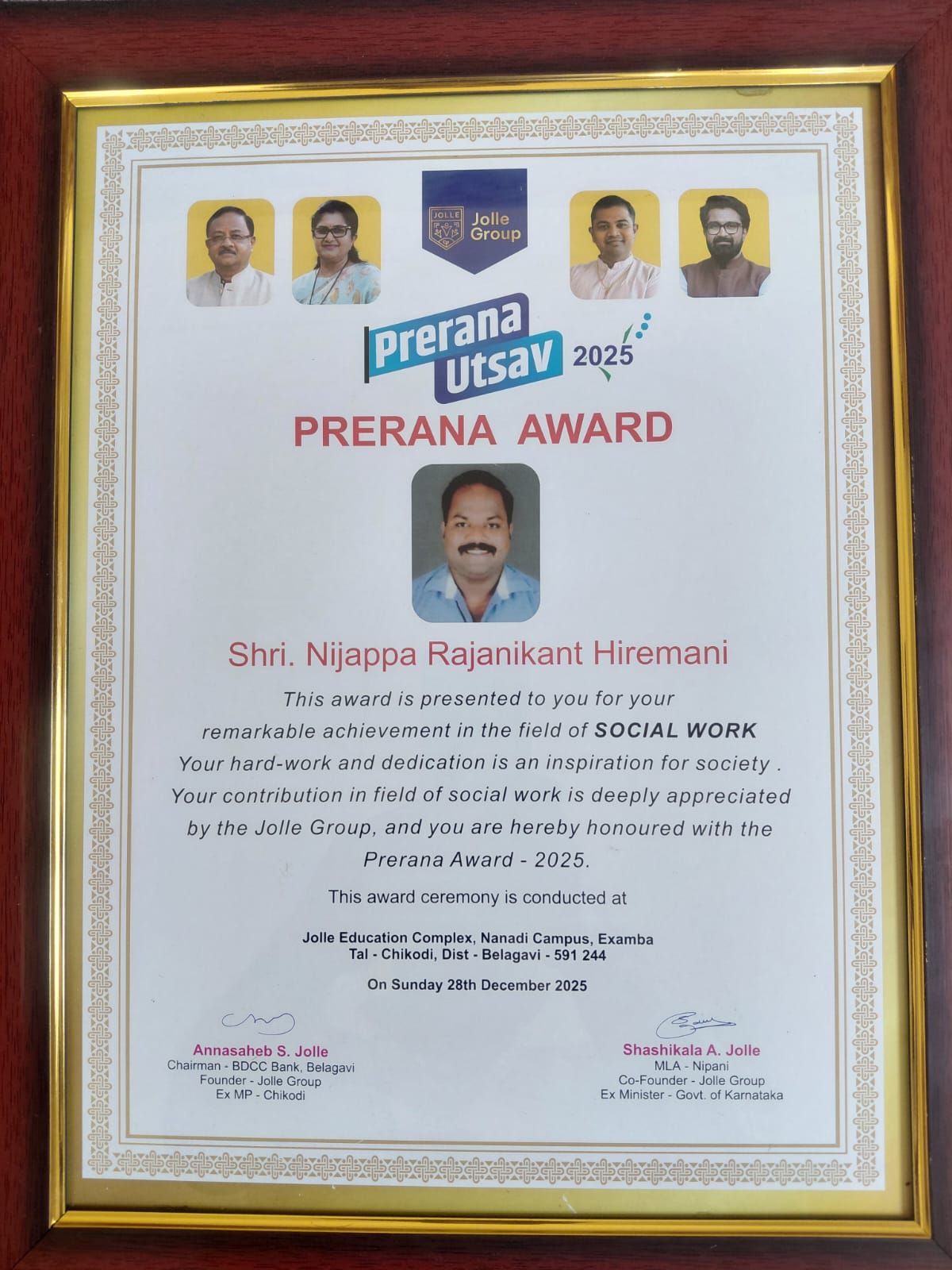ಬೆಳಗಾವಿ ಜಿಲ್ಲೆ ಚಿಕ್ಕೋಡಿ ಸತತ ಶ್ರೀ ನಿಜಪ್ಪ ರಜನೀಕಾಂತ್ ಹಿರೇಮಣಿ ಸಾಮಾಜಿಕ ಕಾರ್ಯ ಕ್ಷೇತ್ರದಲ್ಲಿ ನಿಮ್ಮ ಗಮನಾರ್ಹ ಸಾಧನೆಗಾಗಿ ಈ ಪ್ರಶಸ್ತಿಯನ್ನು ನಿಮಗೆ ಪ್ರದಾನ ಮಾಡಲಾಗಿದೆ ನಿ