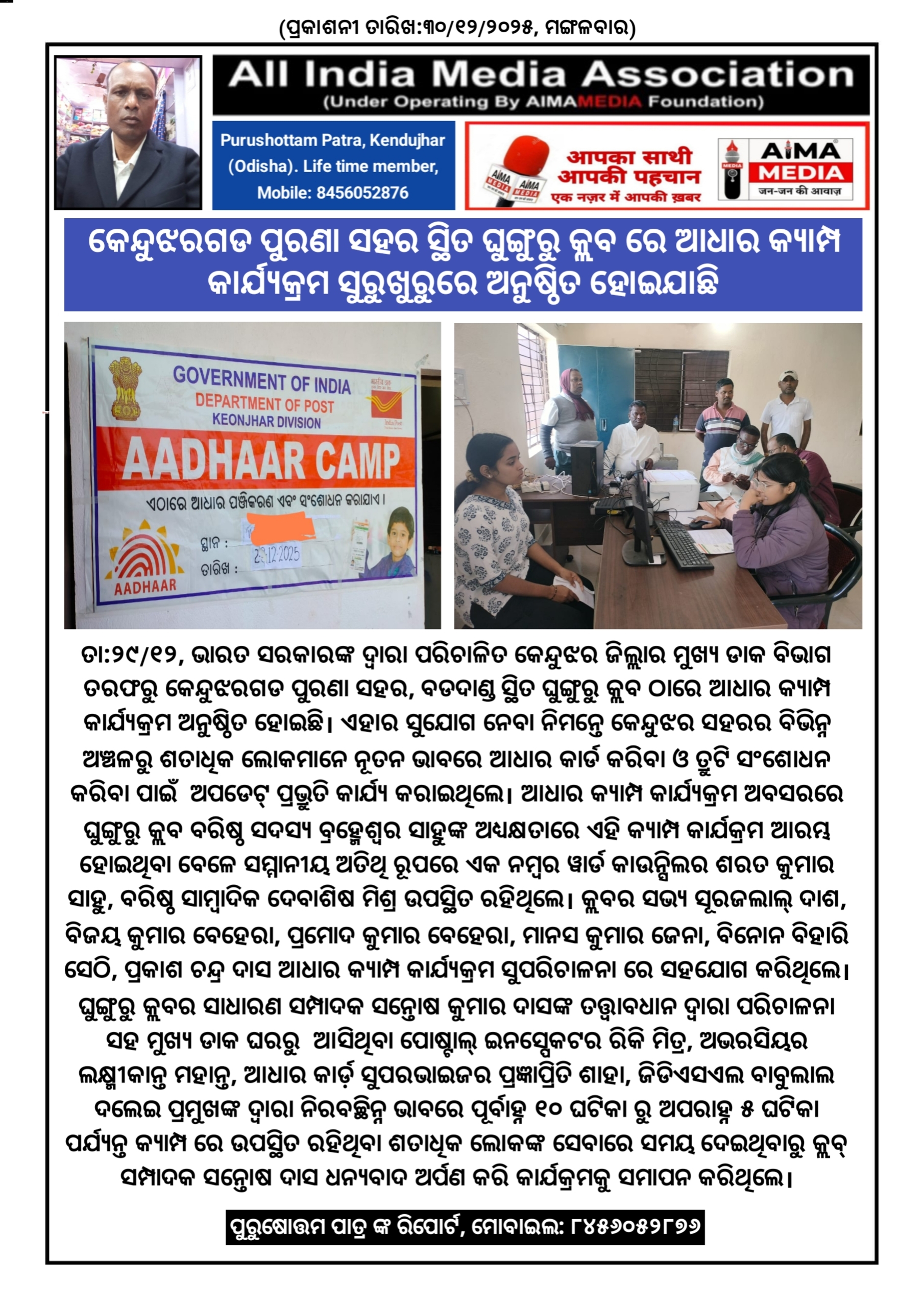 ତା:୨୯/୧୨, ଭାରତ ସରକାରଙ୍କ ଦ୍ବାରା ପରିଚାଳିତ କେନ୍ଦୁଝର ଜିଲ୍ଲାର ମୁଖ୍ଯ ଡାକ ବିଭାଗ ତରଫରୁ କେନ୍ଦୁଝରଗଡ ପୁରଣା ସହର, ବଡଦାଣ୍ଡ ସ୍ଥିତ ଘୁଙ୍ଗୁରୁ କ୍ଲବ ଠାରେ ଆଧାର କ୍ୟାମ୍ପ କାର୍ଯ୍ୟକ୍ରମ ଅନୁଷ୍ଠିତ ହୋଇଛି। ଏହାର ସୁଯୋଗ ନେବା ନିମନ୍ତେ କେନ୍ଦୁଝର ସହରର ବିଭିନ୍ନ ଅଞ୍ଚଳରୁ ଶତାଧିକ ଲୋକମାନେ ନୂତନ ଭାବରେ ଆଧାର କାର୍ଡ କରିବା ଓ ତ୍ରୁଟି ସଂଶୋଧନ କରିବା ପାଇଁ ଅପଡେଟ୍ ପ୍ରଭ୍ରୁତି କାର୍ଯ୍ୟ କରାଇଥିଲେ। ଆଧାର କ୍ୟାମ୍ପ କାର୍ଯ୍ୟକ୍ରମ ଅବସରରେ ଘୁଙ୍ଗୁରୁ କ୍ଲବ ବରିଷ୍ଠ ସଦସ୍ୟ ବ୍ରହ୍ମେଶ୍ୱର ସାହୁଙ୍କ ଅଧ୍ୟକ୍ଷତାରେ ଏହି କ୍ୟାମ୍ପ କାର୍ଯକ୍ରମ ଆରମ୍ଭ ହୋଇଥିବା ବେଳେ ସମ୍ମାନୀୟ ଅତିଥି ରୂପରେ ଏକ ନମ୍ବର ୱାର୍ଡ କାଉନ୍ସିଲର ଶରତ କୁମାର ସାହୁ, ବରିଷ୍ଠ ସାମ୍ବାଦିକ ଦେବାଶିଷ ମିଶ୍ର ଉପସ୍ଥିତ ରହିଥିଲେ। କ୍ଲବର ସଭ୍ୟ ସୂରଜଲାଲ୍ ଦାଶ, ବିଜୟ କୁମାର ବେହେରା, ପ୍ରମୋଦ କୁମାର ବେହେରା, ମାନସ କୁମାର ଜେନା, ବିନୋନ ବିହାରି ସେଠି, ପ୍ରକାଶ ଚନ୍ଦ୍ର ଦାସ ଆଧାର କ୍ୟାମ୍ପ କାର୍ଯ୍ୟକ୍ରମ ସୁପରିଚାଳନା ରେ ସହଯୋଗ କରିଥିଲେ। ଘୁଙ୍ଗୁରୁ କ୍ଲବର ସାଧାରଣ ସମ୍ପାଦକ ସନ୍ତୋଷ କୁମାର ଦାସଙ୍କ ତତ୍ତ୍ବାବଧାନ ଦ୍ବାରା ପରିଚାଳନା ସହ ମୁଖ୍ଯ ଡାକ ଘରରୁ ଆସିଥିବା ପୋଷ୍ଟାଲ୍ ଇନସ୍ପେକଟର ରିକି ମିତ୍ର, ଅଭରସିୟର ଲକ୍ଷ୍ମୀକାନ୍ତ ମହାନ୍ତ, ଆଧାର କାର୍ଡ଼ ସୁପରଭାଇଜର ପ୍ରଜ୍ଞାପ୍ରିତି ଶାହା, ଜିଡିଏସଏଲ ବାବୁଲାଲ ଦଲେଇ ପ୍ରମୁଖଙ୍କ ଦ୍ବାରା ନିରବଚ୍ଛିନ୍ନ ଭାବରେ ପୂର୍ବାହ୍ନ ୧୦ ଘଟିକା ରୁ ଅପରାହ୍ନ ୫ ଘଟିକା ପର୍ଯ୍ୟନ୍ତ କ୍ୟାମ୍ପ ରେ ଉପସ୍ଥିତ ରହିଥିବା ଶତାଧିକ ଲୋକଙ୍କ ସେବାରେ ସମୟ ଦେଇଥିବାରୁ କ୍ଲବ୍ ସମ୍ପାଦକ ସନ୍ତୋଷ ଦାସ ଧନ୍ୟବାଦ ଅର୍ପଣ କରି କାର୍ଯକ୍ରମକୁ ସମାପନ କରିଥିଲେ।
