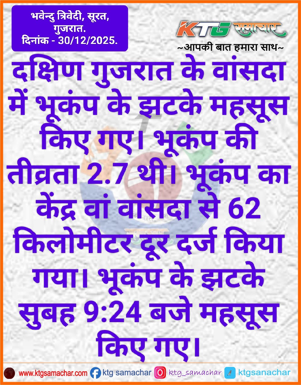 दक्षिण गुजरात के वांसदा में भूकंप के झटके महसूस किए गए।