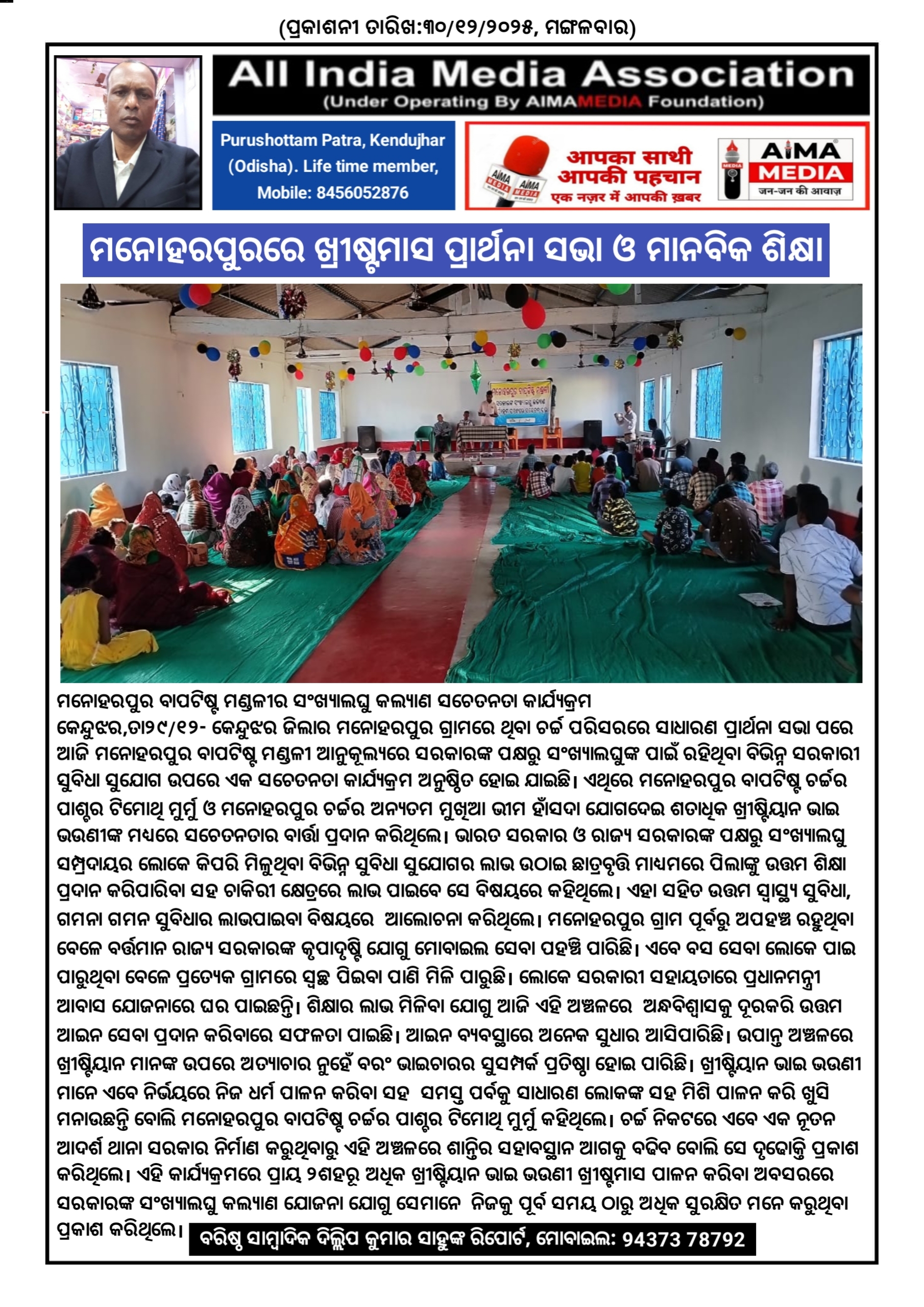 କେନ୍ଦୁଝର ଜିଲାର ମନୋହରପୁର ଗ୍ରାମରେ ଥିବା ଚର୍ଚ୍ଚ ପରିସରରେ ସାଧାରଣ ପ୍ରାର୍ଥନା ସଭା ପରେ ଆଜି ମନୋହରପୁର ବାପଟିଷ୍ଟ ମଣ୍ଡଳୀ ଆନୁକୂଲ୍ୟରେ ସରକାରଙ୍କ ପକ୍ଷରୁ ସଂଖ୍ୟାଲଘୁଙ୍କ ପାଇଁ ରହିଥିବା ବିଭିନ୍ନ ସରକାରୀ ସୁବିଧା ସୁଯୋଗ ଉପରେ ଏକ ସଚେତନତା କାର୍ଯ୍ୟକ୍ରମ ଅନୁଷ୍ଠିତ ହୋଇ ଯାଇଛି। ଏଥିରେ ମନୋହରପୁର ବାପଟିଷ୍ଟ ଚର୍ଚ୍ଚର ପାଶ୍ଚର ଟିମୋଥି ମୁର୍ମୁ ଓ ମନୋହରପୁର ଚର୍ଚ୍ଚର ଅନ୍ୟତମ ମୁଖିଆ ଭୀମ ହାଁସଦା ଯୋଗଦେଇ ଶତାଧିକ ଖ୍ରୀଷ୍ଟିୟାନ ଭାଇ ଭଉଣୀଙ୍କ ମଧ୍ୟରେ ସଚେତନତାର ବାର୍ତ୍ତା ପ୍ରଦାନ କରିଥିଲେ। ଭାରତ ସରକାର ଓ ରାଜ୍ୟ ସରକାରଙ୍କ ପକ୍ଷରୁ ସଂଖ୍ୟାଲଘୁ ସମ୍ପ୍ରଦାୟର ଲୋକେ କିପରି ମିଳୁଥିବା ବିଭିନ୍ନ ସୁବିଧା ସୁଯୋଗର ଲାଭ ଉଠାଇ ଛାତ୍ରବୃତ୍ତି ମାଧ୍ୟମରେ ପିଲାଙ୍କୁ ଉତ୍ତମ ଶିକ୍ଷା ପ୍ରଦାନ କରିପାରିବା ସହ ଚାକିରୀ କ୍ଷେତ୍ରରେ ଲାଭ ପାଇବେ ସେ ବିଷୟରେ କହିଥିଲେ। ଏହା ସହିତ ଉତ୍ତମ ସ୍ୱାସ୍ଥ୍ୟ ସୁବିଧା, ଗମନା ଗମନ ସୁବିଧାର ଲାଭପାଇବା ବିଷୟରେ ଆଲୋଚନା କରିଥିଲେ। ମନୋହରପୁର ଗ୍ରାମ ପୂର୍ବରୁ ଅପହଞ୍ଚ ରହୁଥିବା ବେଳେ ବର୍ତ୍ତମାନ ରାଜ୍ୟ ସରକାରଙ୍କ କୃପାଦୃଷ୍ଟି ଯୋଗୁ ମୋବାଇଲ ସେବା ପହଞ୍ଚି ପାରିଛି। ଏବେ ବସ ସେବା ଲୋକେ ପାଇ ପାରୁଥିବା ବେଳେ ପ୍ରତ୍ୟେକ ଗ୍ରାମରେ ସ୍ଵଚ୍ଛ ପିଇବା ପାଣି ମିଳି ପାରୁଛି। ଲୋକେ ସରକାରୀ ସହାୟତାରେ ପ୍ରଧାନମନ୍ତ୍ରୀ ଆବାସ ଯୋଜନାରେ ଘର ପାଇଛନ୍ତି। ଶିକ୍ଷାର ଲାଭ ମିଳିବା ଯୋଗୁ ଆଜି ଏହି ଅଞ୍ଚଳରେ ଅନ୍ଧବିଶ୍ୱାସକୁ ଦୂରକରି ଉତ୍ତମ ଆଇନ ସେବା ପ୍ରଦାନ କରିବାରେ ସଫଳତା ପାଇଛି। ଆଇନ ବ୍ୟବସ୍ଥାରେ ଅନେକ ସୁଧାର ଆସିପାରିଛି। ଉପାନ୍ତ ଅଞ୍ଚଳରେ ଖ୍ରୀଷ୍ଟିୟାନ ମାନଙ୍କ ଉପରେ ଅତ୍ୟାଚାର ନୁହେଁ ବରଂ ଭାଇଚାରର ସୁସମ୍ପର୍କ ପ୍ରତିଷ୍ଠା ହୋଇ ପାରିଛି। ଖ୍ରୀଷ୍ଟିୟାନ ଭାଇ ଭଉଣୀ ମାନେ ଏବେ ନିର୍ଭୟରେ ନିଜ ଧର୍ମ ପାଳନ କରିବା ସହ ସମସ୍ତ ପର୍ବକୁ ସାଧାରଣ ଲୋକଙ୍କ ସହ ମିଶି ପାଳନ କରି ଖୁସି ମନାଉଛନ୍ତି ବୋଲି ମନୋହରପୁର ବାପଟିଷ୍ଟ ଚର୍ଚ୍ଚର ପାଶ୍ଚର ଟିମୋଥି ମୁର୍ମୁ କହିଥିଲେ। ଚର୍ଚ୍ଚ ନିକଟରେ ଏବେ ଏକ ନୂତନ ଆଦର୍ଶ ଥାନା ସରକାର ନିର୍ମାଣ କରୁଥିବାରୁ ଏହି ଅଞ୍ଚଳରେ ଶାନ୍ତିର ସହାବସ୍ଥାନ ଆଗକୁ ବଢିବ ବୋଲି ସେ ଦୃଢୋକ୍ତି ପ୍ରକାଶ କରିଥିଲେ। ଏହି କାର୍ଯ୍ୟକ୍ରମରେ ପ୍ରାୟ ୨ଶହରୂ ଅଧିକ ଖ୍ରୀଷ୍ଟିୟାନ ଭାଇ ଭଉଣୀ ଖ୍ରୀଷ୍ଟମାସ ପାଳନ କରିବା ଅବସରରେ ସରକାରଙ୍କ ସଂଖ୍ୟାଲଘୁ କଲ୍ୟାଣ ଯୋଜନା ଯୋଗୁ ସେମାନେ ନିଜକୁ ପୂର୍ବ ସମୟ ଠାରୁ ଅଧିକ ସୁରକ୍ଷିତ ମନେ କରୁଥିବା ପ୍ରକାଶ କରିଥିଲେ।