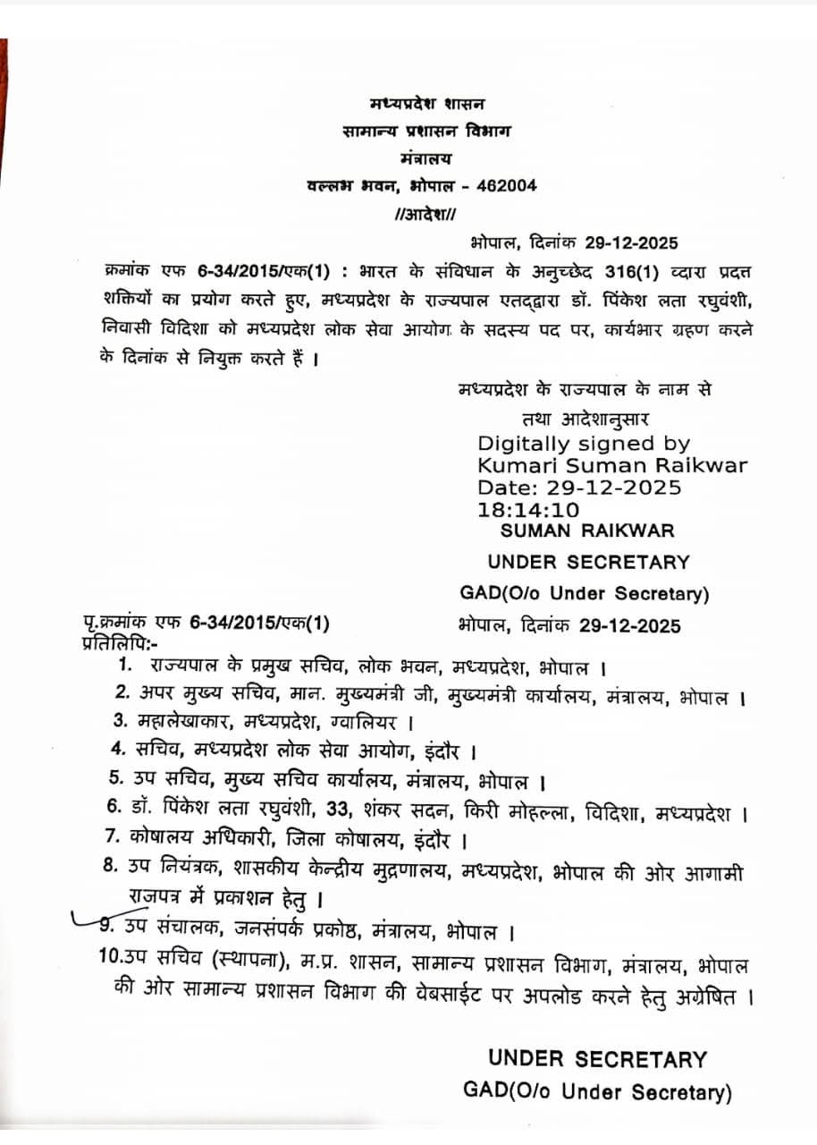 सामान्य प्रशासन विभाग द्वारा डॉ. पिंकेश लता रघुवंशी को मध्यप्रदेश लोक सेवा आयोग के सदस्य पद पर नियुक्त किए जाने संबंधी जारी किए आदेश