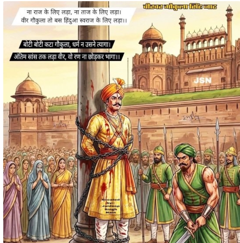 अंततः तिलपत की लड़ाई में वीर गोकुला बंदी बनाए गए। आगरा की कोतवाली के सामने फव्वारा चौक पर 1 जनवरी 1670 को उन्हें जंजीरों से बांधकर अत्याचार का सामना करना पड़ा। धर्मांतरण के दबाव के बीच उनके निकटजनों पर क्रूरता ढाई गई, किंतु वीर गोकुला अडिग रहे। हर क्षण, हर पीड़ा के साथ उनसे अपने विश्वास से विमुख होने को कहा गया—परंतु वह योद्धा अंतिम सांस तक अटल रहा और धर्म व राष्ट्र की रक्षा के लिए सर्वस्व बलिदान कर गया।