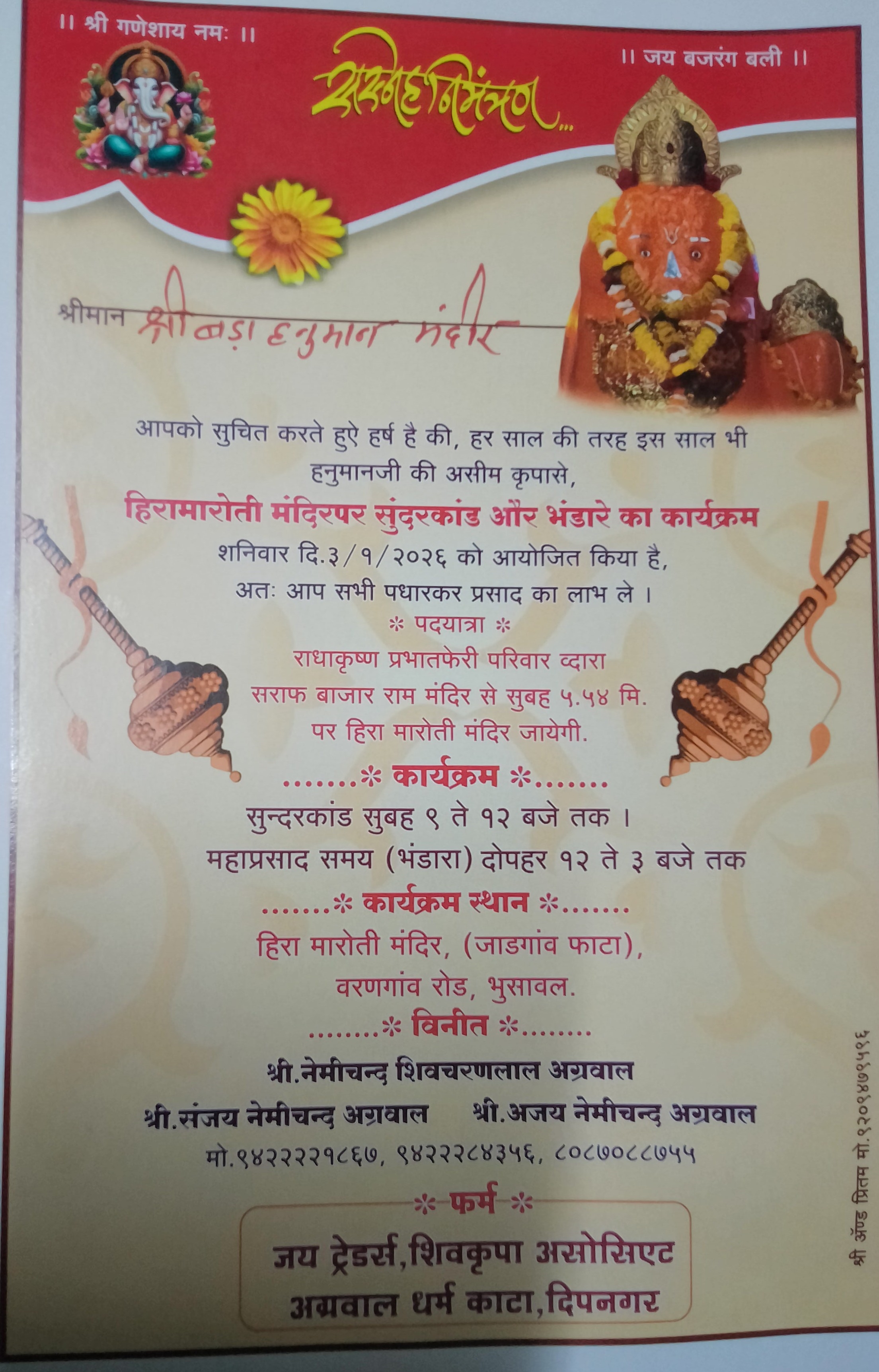 दिनांक 03/जन/2026 शनिवार हीरामारोती मंदिर जाड़गांव फाटा यहां सुबह 9 बजे से दोपहर 12 बजे तक सुंदरकांड व दोपहर 12 से 3 बजे तक भंडारे का आयोजन किया गया है।