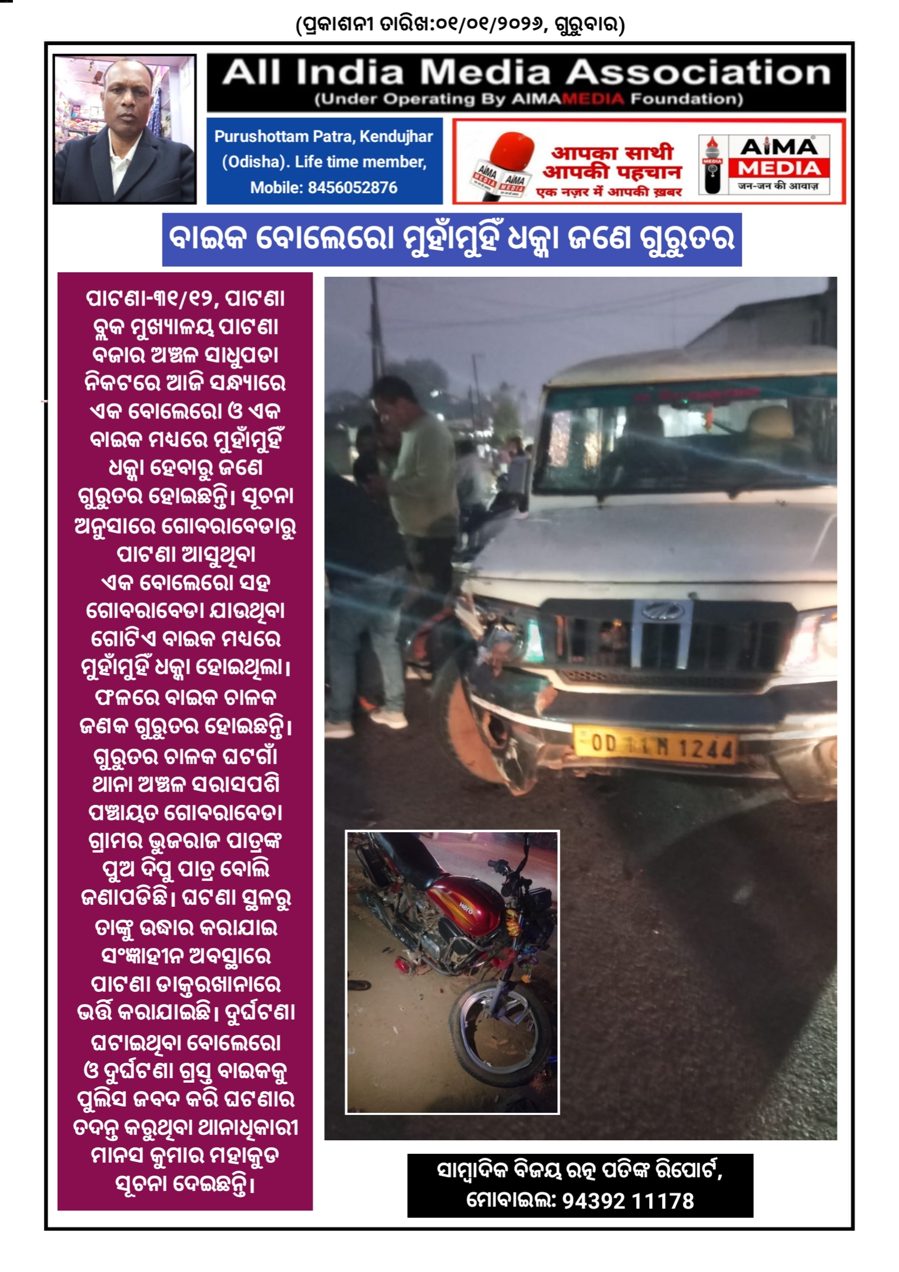 ପାଟଣା-୩୧/୧୨, ପାଟଣା ବ୍ଲକ ମୁଖ୍ୟାଳୟ ପାଟଣା ବଜାର ଅଞ୍ଚଳ ସାଧୁପଡା ନିକଟରେ ଆଜି ସନ୍ଧ୍ୟାରେ ଏକ ବୋଲେରୋ ଓ ଏକ ବାଇକ ମଧ୍ୟରେ ମୁହାଁମୁହିଁ ଧକ୍କା ହେବାରୁ ଜଣେ ଗୁରୁତର ହୋଇଛନ୍ତି। ସୂଚନା ଅନୁସାରେ ଗୋବରାବେଡାରୁ ପାଟଣା ଆସୁଥିବା ଏକ ବୋଲେରୋ ସହ ଗୋବରାବେଡା ଯାଉଥିବା ଗୋଟିଏ ବାଇକ ମଧ୍ୟରେ ମୁହାଁମୁହିଁ ଧକ୍କା ହୋଇଥିଲା। ଫଳରେ ବାଇକ ଚାଳକ ଜଣକ ଗୁରୁତର ହୋଇଛନ୍ତି।ଗୁରୁତର ଚାଳକ ଘଟଗାଁ ଥାନା ଅଞ୍ଚଳ ସରାସପଶି ପଞ୍ଚାୟତ ଗୋବରାବେଡା ଗ୍ରାମର ଭୁଜରାଜ ପାତ୍ରଙ୍କ ପୁଅ ଦିପୁ ପାତ୍ର ବୋଲି ଜଣାପଡିଛି। ଘଟଣା ସ୍ଥଳରୁ ତାଙ୍କୁ ଉଦ୍ଧାର କରାଯାଇ ସଂଜ୍ଞାହୀନ ଅବସ୍ଥାରେ ପାଟଣା ଡାକ୍ତରଖାନାରେ ଭର୍ତ୍ତି କରାଯାଇଛି। ଦୁର୍ଘଟଣା ଘଟାଇଥିବା ବୋଲେରୋ ଓ ଦୁର୍ଘଟଣା ଗ୍ରସ୍ତ ବାଇକକୁ ପୁଲିସ ଜବଦ କରି ଘଟଣାର ତଦନ୍ତ କରୁଥିବା ଥାନାଧିକାରୀ ମାନସ କୁମାର ମହାକୁଡ ସୂଚନା ଦେଇଛନ୍ତି।