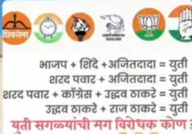 महाराष्ट्र की सियासत में गठबंधनों को लेकर जारी उलझन एक बार फिर चर्चा में है। सोशल मीडिया पर वायरल हो रही एक तस्वीर ने राजनीतिक हलकों में नई बहस छेड़ दी है। इस तस्वीर में अलग अलग राजनीतिक दलों के चिन्ह दिखाए गए हैं और उनके साथ संभावित या कथित गठबंधनों के समीकरण लिखे गए हैं।