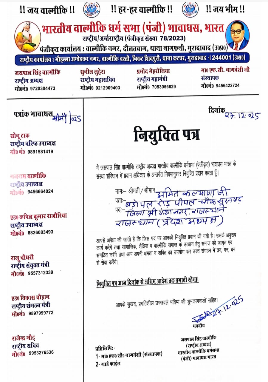 राजस्थान बाल्मीकि धर्म सभा के अमित कल्याणा प्रदेश अध्यक्ष नियुक्त