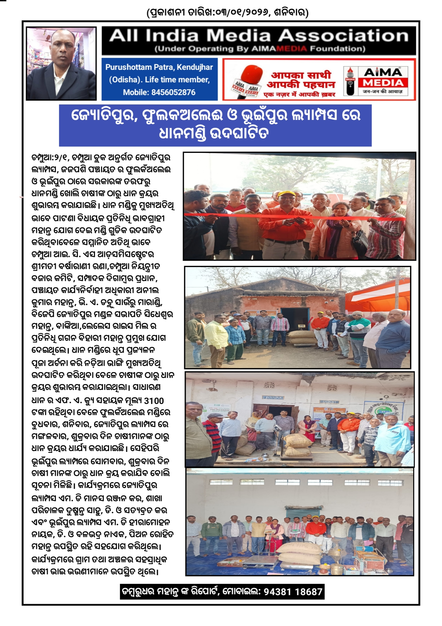 ଚମ୍ପୁଆ -୨/୧, ଚମ୍ପୁଆ ବ୍ଲକ ଅନ୍ତର୍ଗତ ଜ୍ୟୋତିପୁର ଲ୍ୟାମ୍ପସ, ଜଜପଶି ପଞ୍ଚାୟତ ର ଫୁଲକଁଅଲେଈ ଓ ଭୂଇଁପୁର ଠାରେ ସରକାରଙ୍କ ତରଫରୁ ଧାନମଣ୍ଡି ଖୋଲି ଚାଷୀଙ୍କ ଠାରୁ ଧାନ କ୍ରୟର ଶୁଭାରମ୍ଭ କରାଯାଇଛି l ଧାନ ମଣ୍ଡିକୁ ମୁଖ୍ୟଅତିଥି ଭାବେ ପାଟଣା ବିଧାୟକ ପ୍ରତିନିଧି ଭାବଗ୍ରାହୀ ମହାନ୍ତ ଯୋଗ ଦେଇ ମଣ୍ଡି ଗୁଡିକ ଉଦଘାଟିତ କରିଥିବାବେଳେ ସମ୍ମାନିତ ଅତିଥି ଭାବେ ଚମ୍ପୁଆ ଆଇ. ସି. ଏସ ଆଡ଼ସମିସଷ୍ଟେଟର ଶ୍ରୀମତୀ ବର୍ଷାରାଣୀ ରଣା,ଚମ୍ପୁଆ ନିୟନ୍ତ୍ରୀତ ବଜାର କମିଟି, ସମ୍ପାଦକ ଦିଗାମ୍ବର ପ୍ରଧାନ, ପଞ୍ଚାୟତ କାର୍ଯ୍ୟନିର୍ବାହୀ ଅଧିକାରୀ ଅନୀଲ କୁମାର ମହାନ୍ତ, ଭି. ଏ. ଡବ୍ଲୁ ସାଉଁରୁ ମାରାଣ୍ଡି, ବିଜେପି ଜ୍ୟୋତିପୁର ମଣ୍ଡଳ ସଭାପତି ସିଧେଶ୍ଵର ମହାନ୍ତ, ବାଙ୍କିଆ,ଲେଲେସ ରାଇସ ମିଲ ର ପ୍ରତିନିଧି ଗଗନ ବିହାରୀ ମହାନ୍ତ ପ୍ରମୁଖ ଯୋଗ ଦେଇଥିଲେ l ଧାନ ମଣ୍ଡିରେ ଧୂପ ପ୍ରଜ୍ୟଳନ ପୂଜା ଅର୍ଚନା କରି ନଡ଼ିଆ ଭାଙ୍ଗି ମୁଖ୍ୟଅତିଥି ଉଦଘାଟିତ କରିଥିବା ବେଳେ ଚାଷୀଙ୍କ ଠାରୁ ଧାନ କ୍ରୟର ଶୁଭାରମ୍ଭ କରାଯାଇଥିଲା l ସାଧାରଣ ଧାନ ର ଏଫ. ଏ. କ୍ୟୁ ସହାୟକ ମୂଲ୍ୟ 3100 ଟଙ୍କା ରହିଥିବା ବେଳେ ଫୁଲକଁଅଲେଈ ମଣ୍ଡିରେ ବୁଧବାର, ଶନିବାର, ଜ୍ୟୋତିପୁର ଲ୍ୟାମ୍ପସ ରେ ମଙ୍ଗଳବାର, ଶୁକ୍ରବାର ଦିନ ଚାଷୀମାନଙ୍କ ଠାରୁ ଧାନ କ୍ରୟର ଧାର୍ଯ୍ୟ କରାଯାଇଛି l ସେହିପରି ଭୂଇଁପୁର ଲ୍ୟାମ୍ପରେ ସୋମବାର, ଶୁକ୍ରବାର ଦିନ ଚାଷୀ ମାନଙ୍କ ଠାରୁ ଧାନ କ୍ରୟ କରାଯିବ ବୋଲି ସୂଚନା ମିଳିଛି l କାର୍ଯ୍ୟକ୍ରମରେ ଜ୍ୟୋତିପୁର ଲ୍ୟାମ୍ପସ ଏମ. ଡି ମାନସ ରଞ୍ଜନ କର, ଶାଖା ପରିଚାଳକ ଦୁଷ୍ମନ୍ତ ସାହୁ, ଡି. ଓ ସତ୍ୟବ୍ରତ କର ଏବଂ ଭୂଇଁପୁର ଲ୍ୟାମ୍ପସ ଏମ. ଡି ହୀରାମୋହନ ନାୟକ, ଡି. ଓ ବଳଭଦ୍ର ନାଏକ, ପିଅନ ରୋହିତ ମହାନ୍ତ ଉପସ୍ଥିତ ରହି ସହଯୋଗ କରିଥିଲେ l କାର୍ଯ୍ୟକ୍ରମରେ ଗ୍ରାମ ତଥା ଅଞ୍ଚଳର ସହସ୍ରାଧିକ ଚାଷୀ ଭାଇ ଭଉଣୀମାନେ ଉପସ୍ଥିତ ଥିଲେ l