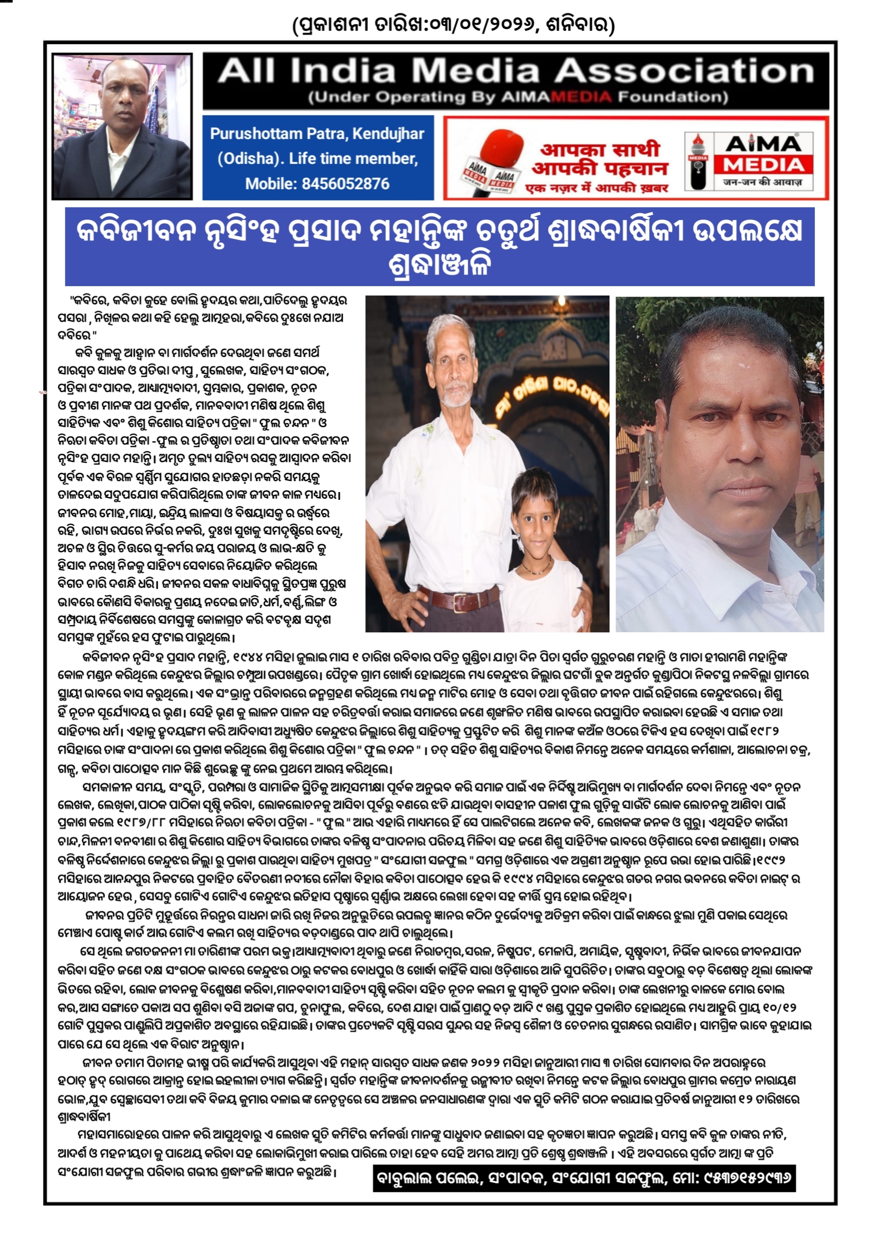 କବିଜୀବନ ନୃସିଂହ ପ୍ରସାଦ ମହାନ୍ତିଙ୍କ ଚତୁର୍ଥ ଶ୍ରାଦ୍ଧବାର୍ଷିକୀ ଉପଲକ୍ଷେ ଶ୍ରଦ୍ଧାଞ୍ଜଳି।