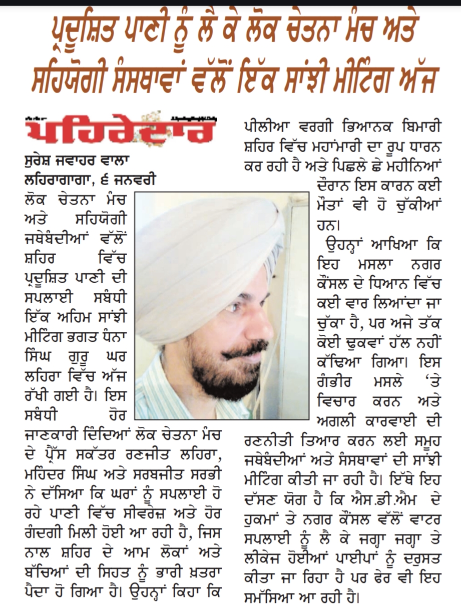6 जनवरी: लहरागागा (सुरेश जवाहर वाला 90233-63132) शहर में गंदे पानी की सप्लाई को लेकर लोक चेतना मंच और उससे जुड़े संगठनों की आज भगत धन्ना सिंह गुरु घर लहरा में एक ज़रूरी जॉइंट मीटिंग हुई। इस बारे में ज़्यादा जानकारी देते हुए लोक चेतना मंच के प्रेस सेक्रेटरी रंजीत लहरा, महिंदर सिंह और सरबजीत सराभी ने बताया कि घरों में सप्लाई होने वाला पानी सीवेज और दूसरी गंदगी के साथ मिल रहा है, जिससे शहर के आम लोगों और बच्चों की सेहत को बहुत बड़ा खतरा पैदा हो गया है। उन्होंने कहा कि शहर में पीलिया जैसी भयानक बीमारी महामारी का रूप ले रही है और पिछले छह महीनों में इसकी वजह से कई मौतें भी हुई हैं।