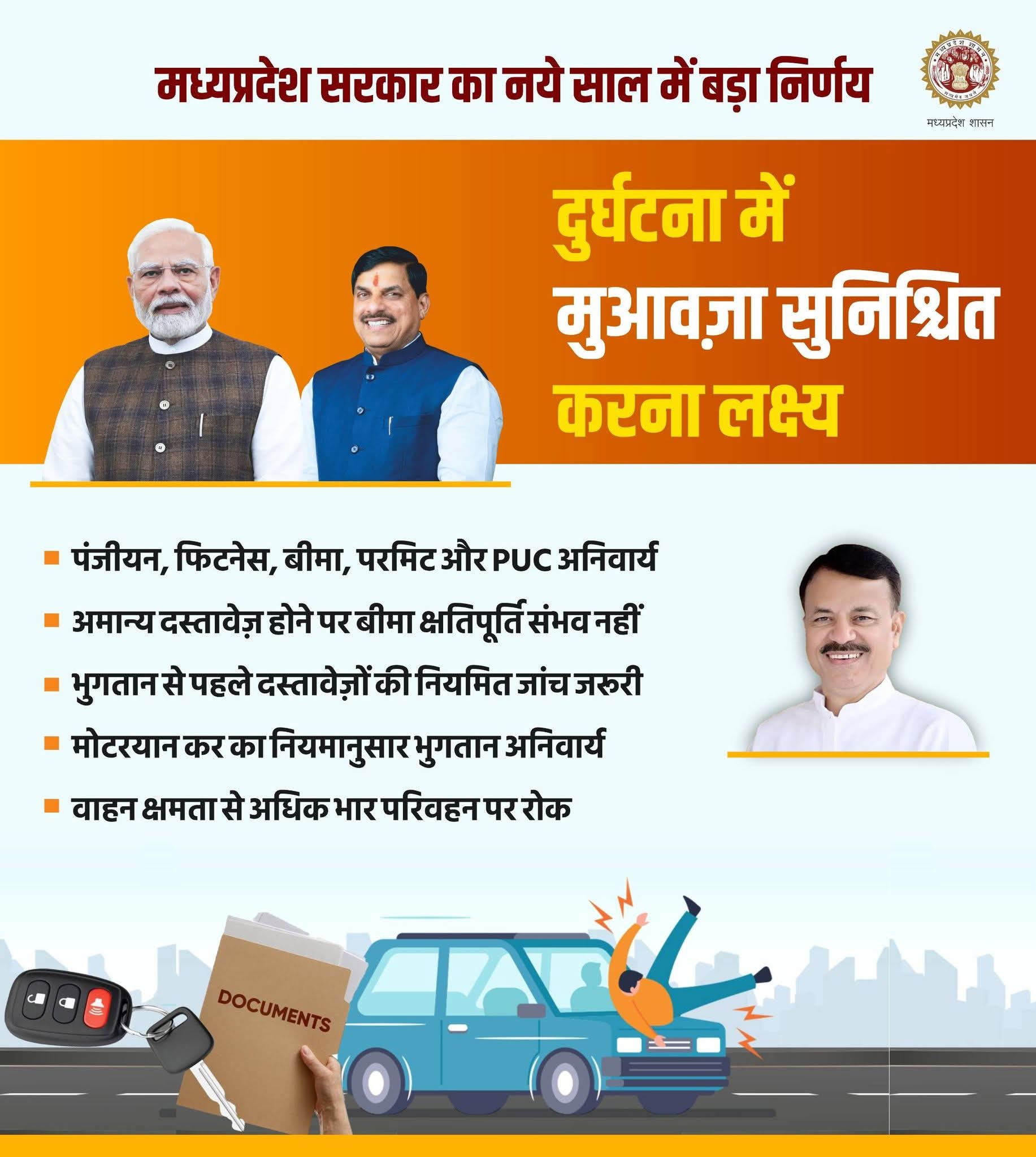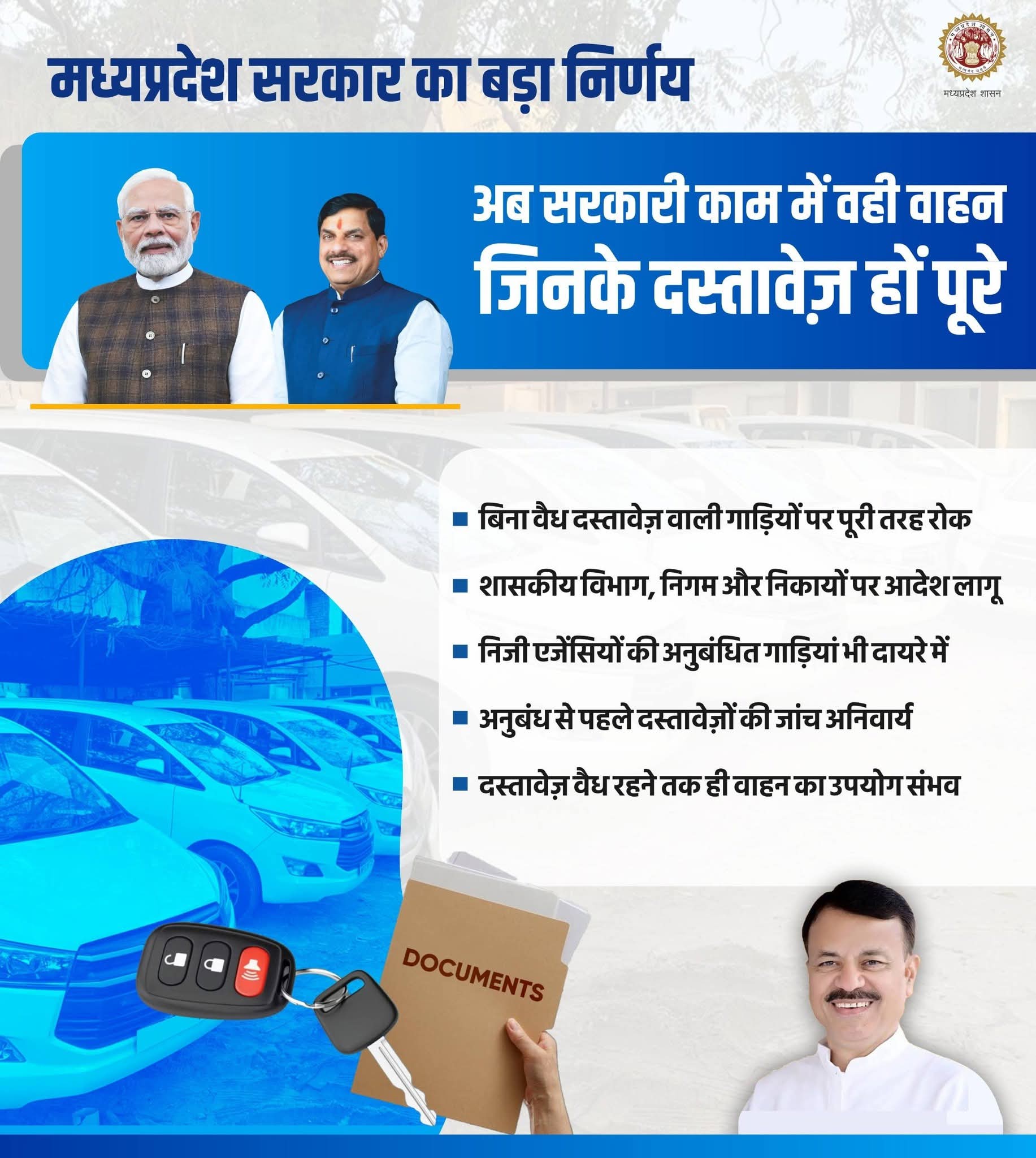 ट्रांसपोर्टेशन को लेकर मध्यप्रदेश से बड़ी खबर है। अब अवैध दस्तावेज वाली गाड़ियां सरकारी काम में इस्तेमाल नहीं की जाएंगी। अगर किसी कंपनी या एजेंसी को अपनी गाड़ियां सरकारी कामों के लिए अनुबंधित करानी हैं तो उसे पूरी तरह से वैध दस्तावेज जमा करने होंगे। दरअसल, परिवहन विभाग ने शासकीय विभागों, निगमों और निकायों के लिए अनुबंधित की जाने वाली गाड़ियों को लेकर सख्त निर्देश जारी किए हैं। इसके मुताबिक, अब बिना वैध दस्तावेजों के किसी भी गाड़ी को सरकारी कामों में नहीं लगाया जाएगा।