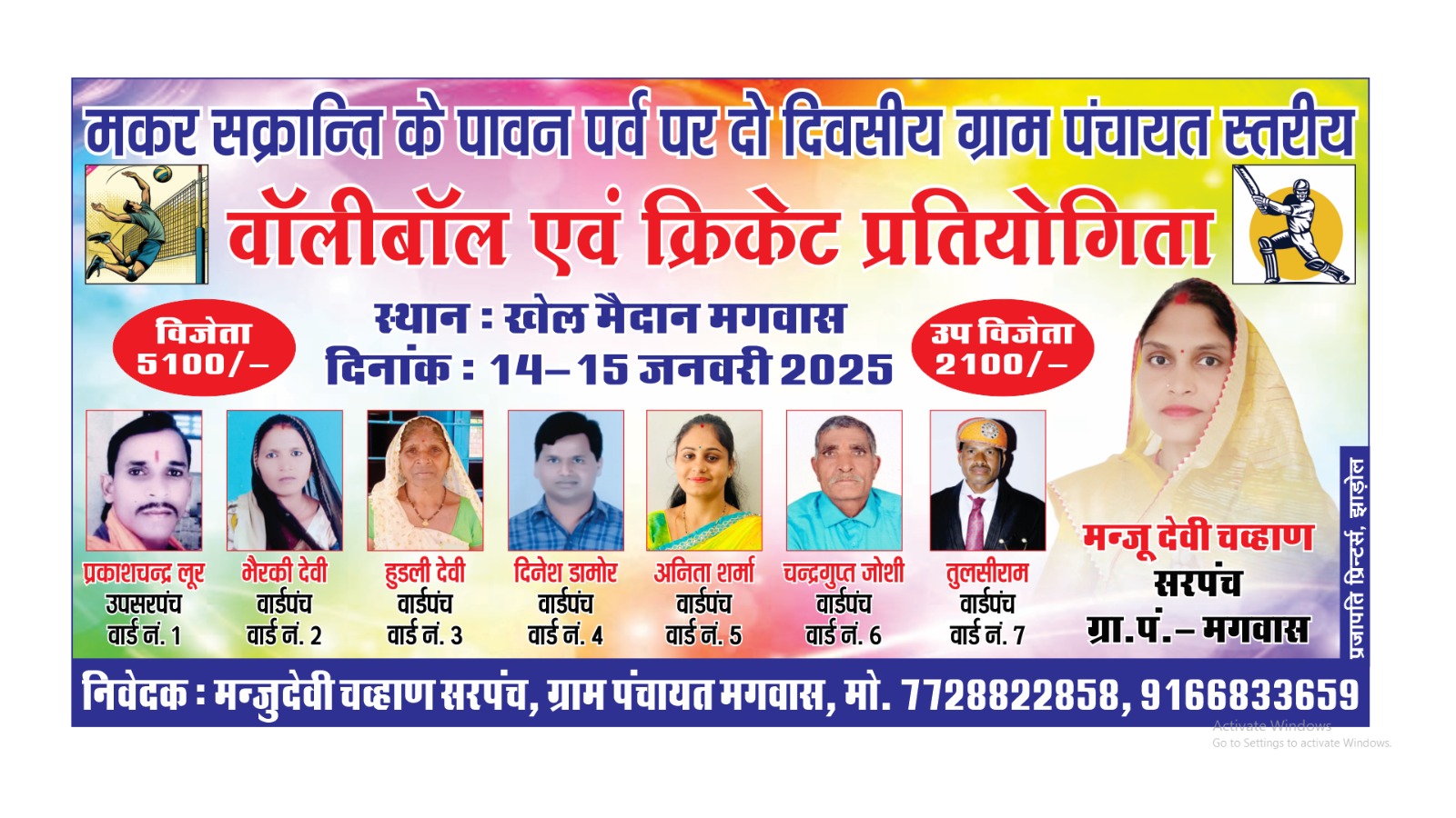 ग्राम पंचायत मगवास में मकर संक्रांति के पावन पर्व पर ग्राम पंचायत स्तरीय दो दिवसीय खेल कूद प्रतियोगिता जिसमें दिनांक 14/01/2026 को वॉलीबॉल ओर दिनांक 15/01/2026 को क्रिकेट प्रतियोगिता का आयोजन मगवास के खेल मैदान पर किया जाएगा जिसमें स्थानीय टीमें भाग लेगी