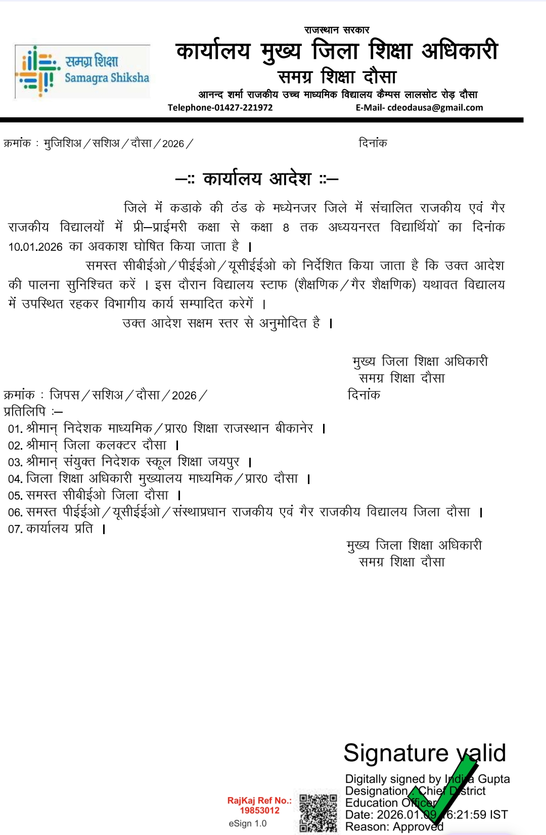 दौसा जिले में कड़ाके की ठंड के मध्येनजर जिले में संचालित राजकीय एवं गैर राजकीय विद्यालयों में प्री-प्राईमरी कक्षा से कक्षा 8 तक अध्ययनरत विद्यार्थियों का दिनांक 10.01.2026 का अवकाश घोषित किया गया