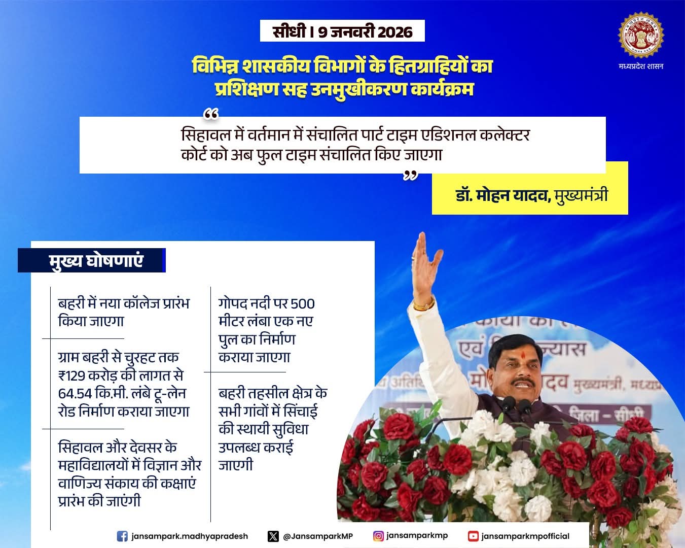 मुख्यमंत्री डॉ. मोहन यादव द्वारा सीधी जिले की सिहावल में विभिन्न शासकीय विभागों के हितग्राहियों का प्रशिक्षण सह उनमुखीकरण कार्यक्रम में सहभगिता